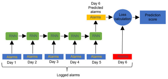 Example of RNN architecture: it processes alarms for five consecutive days and outputs a prediction for the alarms on the sixth day. Such prediction is compared to the alarms actually occurring at the sixth day and a prediction score is calculated leveraging the cross-entropy loss.
