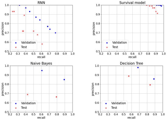 The task of predicting faulty sites can be approached in multiple directions: the first direction is to consider it as a classification task in which we label normal and faulty sites. Within this direction, we also consider anomaly detection methods which will be trained on normal sites and will evaluate the deviation from normal behavior. One of our techniques follows this approach (RNN). The second direction is to consider it as a regression task in which we could consider only the sites which have failed or consider the last known functioning time of all the sites (see for example [,,] where the authors propose a model for remaining useful life prediction). In the presence of right-censored data (where the event of interest has only occurred for a subset of the observations), the regression task will usually result in an underestimate (if we only consider the events) or an overestimate (if we only consider the last known functioning times) of the time-to-event (see for example []). The third direction is to consider it as a time-to-event prediction task (see for example [,,]). One of our techniques follows this approach (time-to-event analysis). Our technique is different from a standard random survival forest because we take into account the evolution of the sites with two extra parameters, the average rolling window and the risk threshold. Estimating the time to failure is a possible way to tackle fault prediction, and it has been explored by several authors. For example, in [] a deep learning model for time to failure prediction was put forward. Here, the authors tackled the problem stemming from the fact that offline data on which the models are trained can, in practice, follow a different distribution from on-line data, on which the models would be tested, and they proposed a technique based on a variational autoencoder and a long-short term memory network. In [], the authors proposed a parallel hybrid neural network with integration of spatial and temporal features for remaining useful life prediction where the spatial features are extracted by a 1-dimensional convolutional neural network and the temporal features are extracted by a bidirectional gated RNN.
