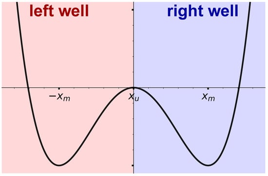 where , and  is the centre of the potential which we set to zero and which serves as a separating point between the regions  (right well) and  (left well), where thermal baths with different features act. The local maximum of the potential is located at , the global minima are at  distanced by , and the potential depth  represents the height of the barrier the particle has to overcome to hop from one well to the other. In order to highlight the spatial separation of the two baths induced by the potential Equation (2), we recast the usual Langevin equation describing the particle dynamics with initial conditions  and  into the following form