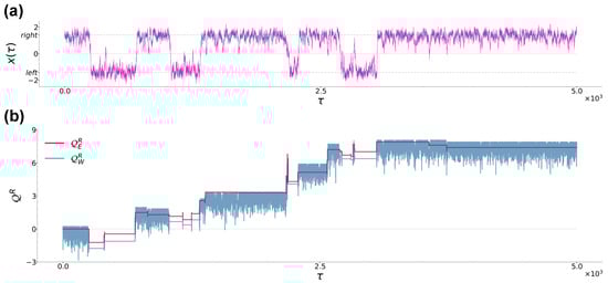 In order to provide some physical intuition about the difference between the heat definitions from Equations (12) and (13), in Figure 2a we show a typical particle trajectory in case (a), while in Figure 2b we show the corresponding realisations of  and  during the same time interval (numerical data are obtained using the numerical techniques described in Section 2.3). Note that  is piecewise continuous and presents discontinuous variations only when jump events occur, while  continuously evolves when the particle is in the right well, remaining constant when the particle jumps in the left well, and showing significant variations only when jump events occur. Note also that during the first permanence of the particle in the left well,  averages to zero, in agreement with the fact that during that time interval, the particle is thermalized with the right-well bath and the latter has not yet received any energy injection from the left-well bath.