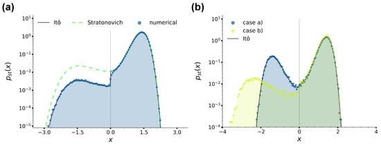 with  a normalisation factor, which, contrary to Equation (22), is always continuous at  also when . We would like to stress that the difference between Equations (22) and (23) can be ultimately traced back to the presence of two regions with different temperatures. In fact, as mentioned in Section 2.1, in case (a), the Langevin equation Equation (3) can be recast as Equation (6), which is characterised by a multiplicative noise due to the presence of the x-dependent temperature . Therefore, as well known from the literature [,], applying different integration schemes leads to different results, hence the different drift coefficients for the stationary Fokker–Planck equation in the Itô and Stratonovich prescriptions and the resulting different stationary distributions Equations (22) and (23). In Figure 3a, we provide a comparison between these two stationary solutions and the numerical position distributions at  obtained by integrating the equations of motions as described in Section 2.3 and setting  and , so that . The figure at the same time shows that the numerical algorithms we used perform the integration under the Itô prescription and confirms the presence of the jump discontinuity in Equation (22).