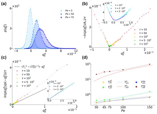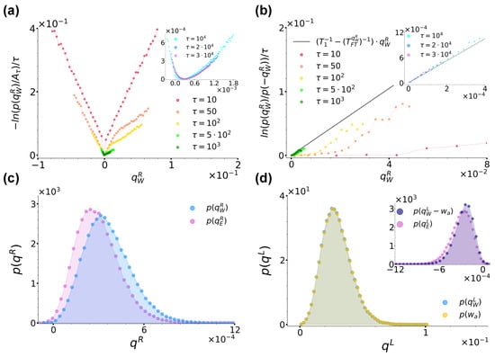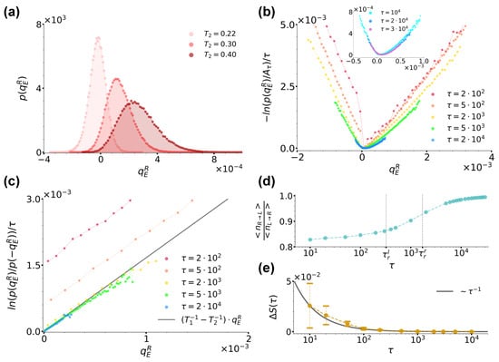 In order to study the validity of Equation (1), we first focused on the trend of , which in the large time limit converges to the rate function  whenever  satisfies a large-deviation principle [,,]. More specifically, in Figure 4b, we report  extracted at different sampling times ’s, as reported by the legend. At each sampling time,  denotes the maximum of the distribution and in the ratio, it makes the resulting curves shift vertically so as to have a minimum value of zero. As highlighted by the inset of Figure 4b, for , we observe that the curves do overlap, thus implying that  satisfies a large-deviation principle. We therefore proceeded to check the validity of Equation (1) as prescribed by Equation (21). We used data from Figure 4b and report the resulting curves at the same ’s in Figure 4c, as denoted by the legend. We found that at all ’s, these curves were linear and, within numerical error, with a slope in agreement with , so that we could identify  with  and  with . We would like to underline that while previous results proved a fluctuation theorem like Equation (1) to stand in the case of two different thermal baths separately at equilibrium but acting simultaneously everywhere in the system [,,], our results extend this scenario to the case of spatially separated baths.
