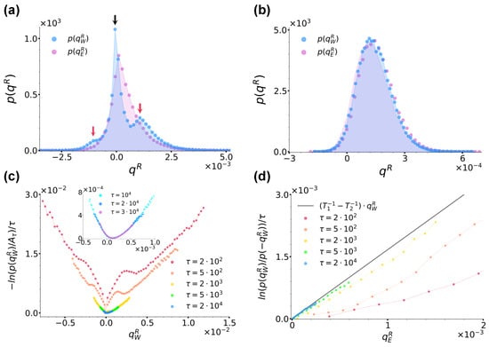 We now discuss the validity of the fluctuation theorem from Equation (1) for  by studying  in comparison with . In Figure 5a,b, we compare the distributions  and  for the same parameter choice as in Figure 4b at sampling times  and , respectively. Let us focus on Figure 5a first. What immediately catches the eye is that, contrary to  and as highlighted by the vertical arrows,  is characterised by three peaks. This peculiar structure can be readily explained by recalling the jump phenomenology discussed above. The left and right external peaks highlighted by the red arrows are due to particles leaving and entering the right well, which are then responsible for negative and positive energy exchanges, respectively. Since here, , more particles have jumped from left to right than in the opposite direction, hence the higher right peak. However, in our large sample of  independent realizations, at that time, a large number of particles have not yet jumped at all from the right well, but rather have been exchanging an average zero heat with the equilibrium thermal bath in that well, hence the central peak located at  highlighted by the black arrow. At large times,  instead loses its three-peak structure and comes to coincide with  from Figure 4b. In particular, the central peak disappears because at large times, it is extremely probable that all particles have already jumped almost once, while the other two become closer and closer until eventually merging. This overall scenario is graphically confirmed and clarified by Figure 5c, which reports the curves  extracted at different sampling times ’s, as denoted by the legend. The figure, in fact, at the same time shows the two external peaks clearly getting closer until eventually merging and also the curves converging towards a convex rate function . Combining further this last information with the content of Figure 4b and Figure 5b, we can therefore affirm that at large times, . The curves from Figure 5c allow us to finally check the validity of a fluctuation theorem for  as prescribed by Equation (21). Figure 5d reports the ratio  evaluated at different sampling times using data from Figure 5c and, as highlighted by the black line reporting Equation (21) plotted with  and , shows that at large sampling time ,  indeed satisfies the same fluctuation theorem shown in Figure 4c and satisfied by  with the same slope. Note that at short times, the fluctuation theorem is not satisfied because of the sub-exponential contribution , which encodes the three-peak structure of  and makes the curve actually curvilinear rather than rigidly vertically shifted. To conclude, we report that for the left well, we checked that  and consequently, that the same results discussed until this point for  symmetrically still applied, so that the energy balance Equation (19)’s results were satisfied.