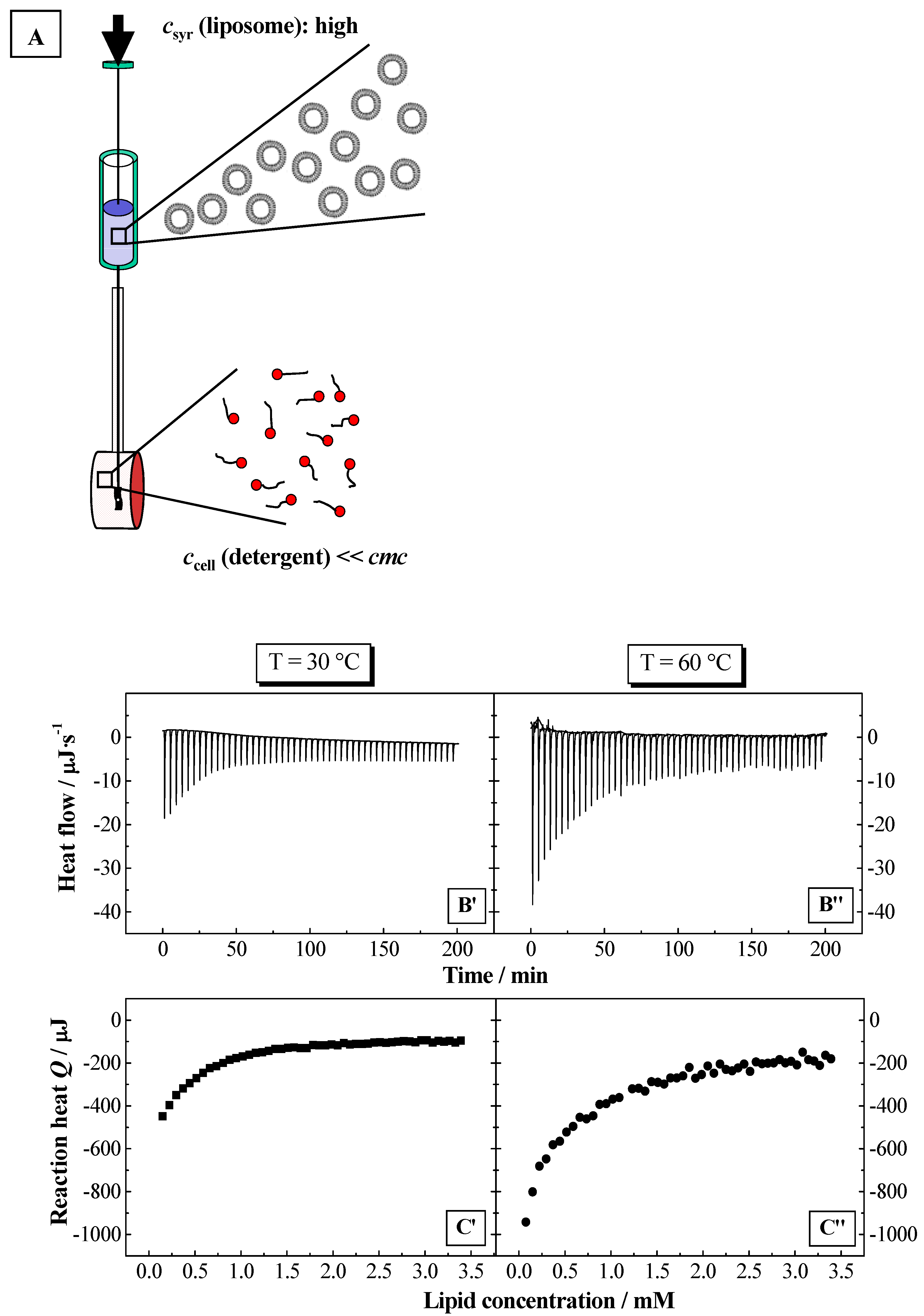 (A) Schematic representation of an ITC partition experiment. The syringe is loaded with a liposome dispersion and is titrated to a monomer detergent solution (ccell(detergent) << cmc). (B) Titration of a SPC (soy bean phosphatidylcholine) liposome dispersion (20 mM, 0.1 M NaCl, pH 7.4) into NaC (4 mM, 0.1 M NaCl, pH 7.4) in steps of 5 μl, 50 injections. (B’) calorimetric traces at 30 °C and (B’’) 60 °C. The derived reaction heat ΔQ of each injection versus lipid concentration (SPC) in the cell is represented in (C’) for 30 °C and (C’’) 60 °C.