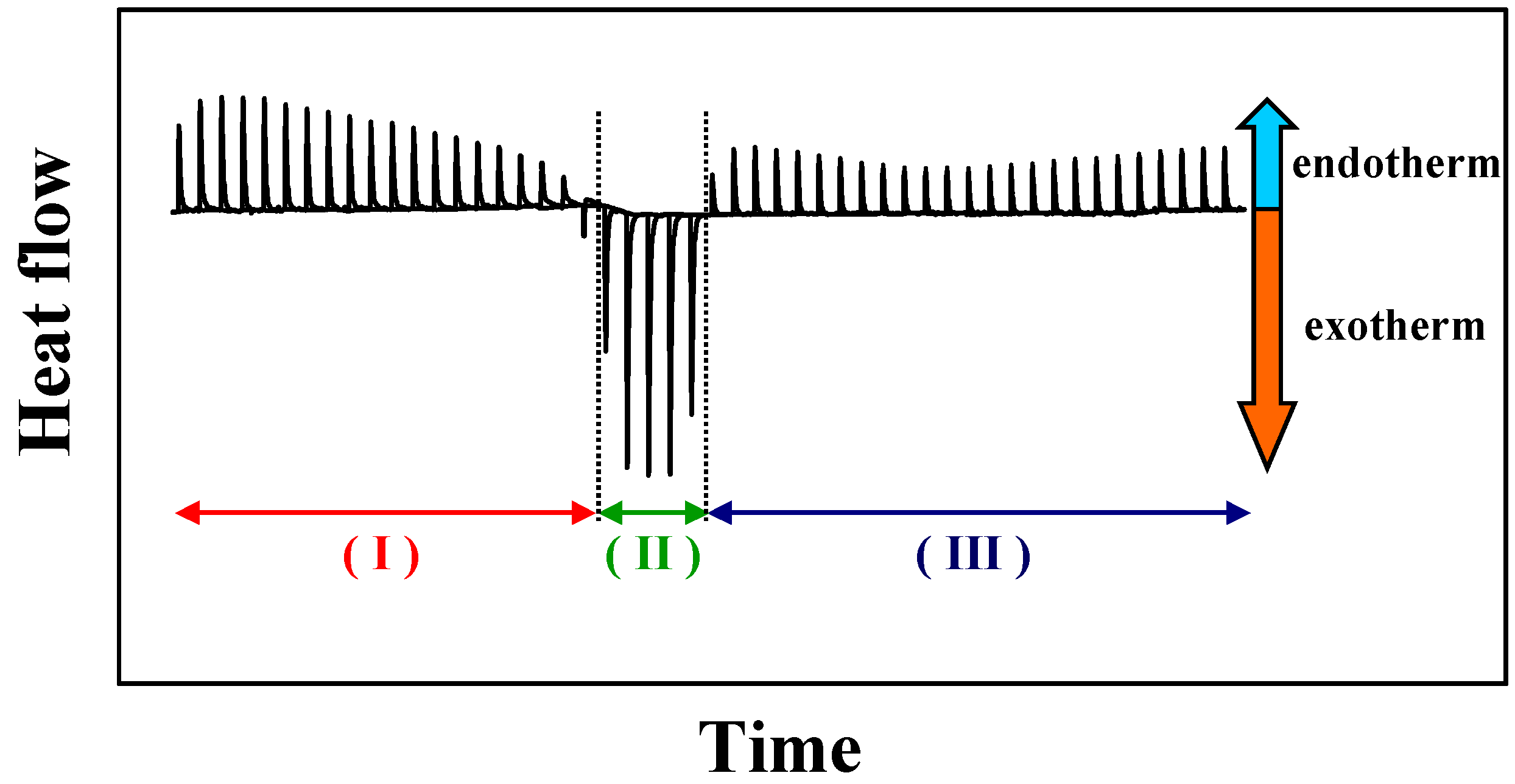 Thus, the addition of high concentrated detergent solutions to lipid dispersions results in the phase transition of liposomes into mixed micelles, the so-called ‘solubilisation’ process (Figure 2). A typical solubilisation experiment is shown in Figure 5. A highly concentrated detergent solution is titrated to a liposome dispersion. Under the chosen experimental conditions the first injections induce a continuous endothermic course (Figure 5, range I) in the heat flow versus time run.