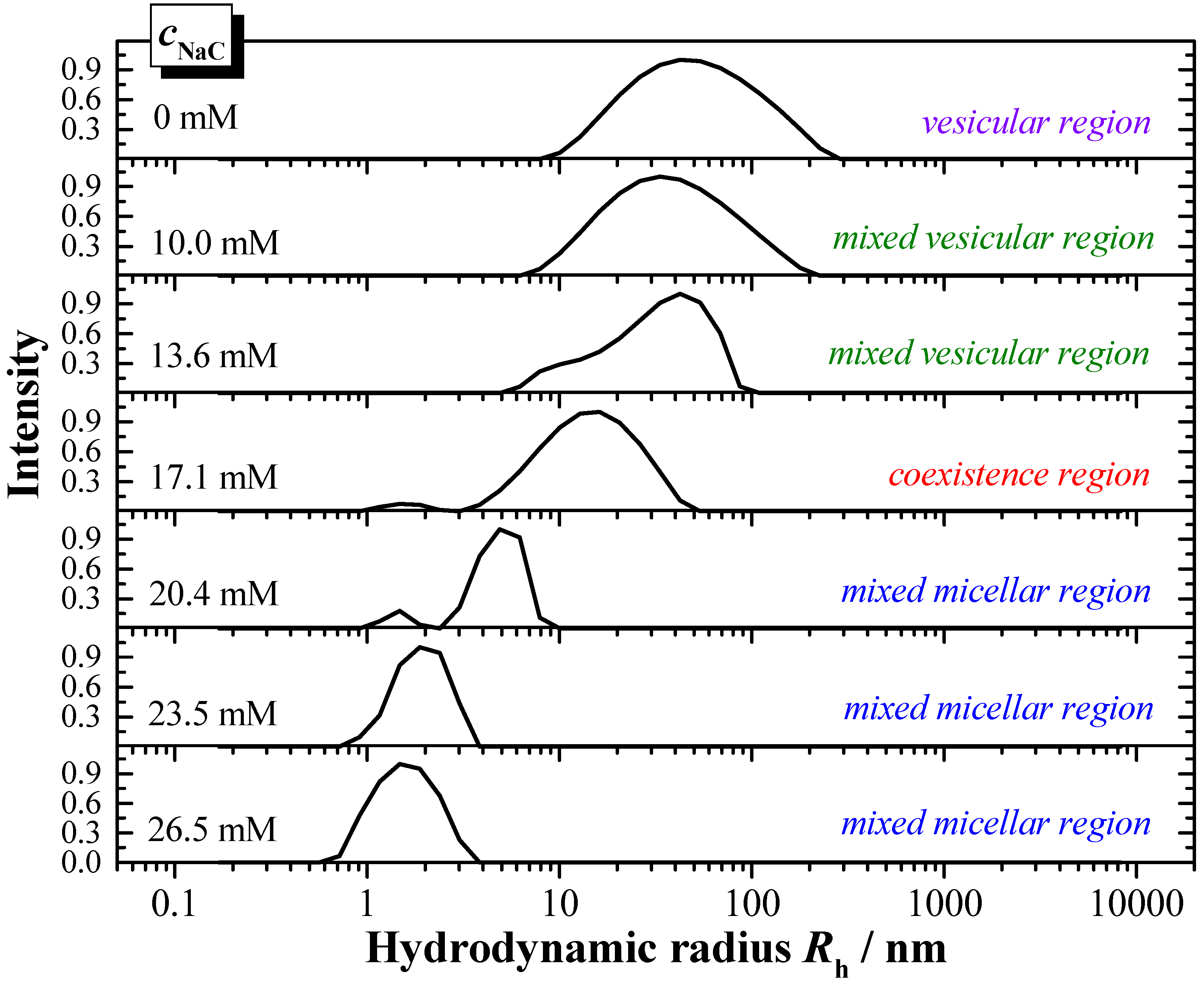 NaC is the tri-hydroxy, whereas NaDC is the di-hydroxy bile salt variant. Under physiological conditions bile salts are negatively charged and bear one negative element charge. Clearly defined phospholipid model membranes (liposomes) were used [54], in order to understand unambiguously the membranolytic detergent effect. Additionally, environmental conditions like temperature, ionic strength were considered.