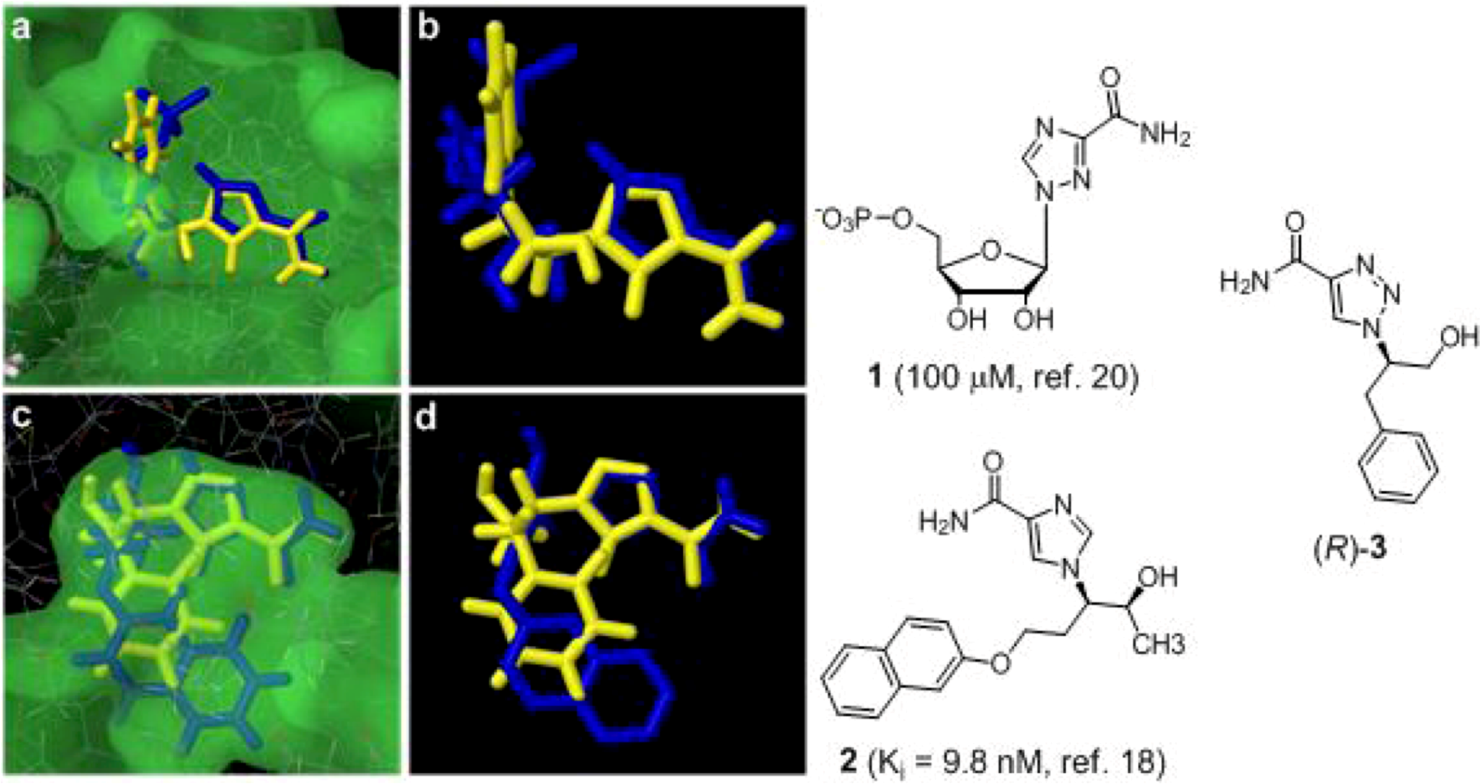 Therefore, (R)-3 was also docked into the ADA system in order to investigate the similarity of the 1,4-disubstituted-1,2,3-triazoles to the imidazole-based nucleoside analogue 2 (Figure 1C). The docking results from Glide (XP docking mode) show that our model compounds (yellow) superimposes the imidazole of the inhibitor in the binding pocket of the X-ray structure (Figure 1D).