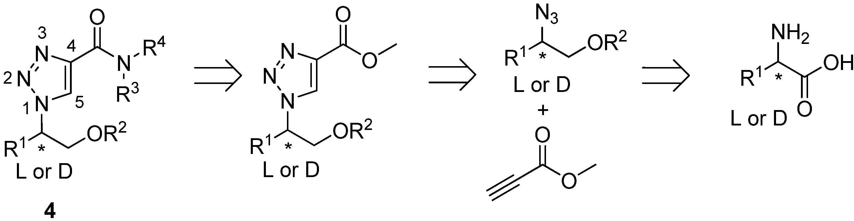 Here, we report an efficient synthesis of compounds represented by structure 4 (Figure 2) by performing [3+2] cycloaddition reactions followed by ester aminolysis. According to the general strategy outlined in Figure 2, our synthesis of the 1,4-disubstituted-1,2,3-triazoles commenced with the preparation of amino alcohols 10-14 by reduction of the corresponding amino acids 5-9 (Table 1).