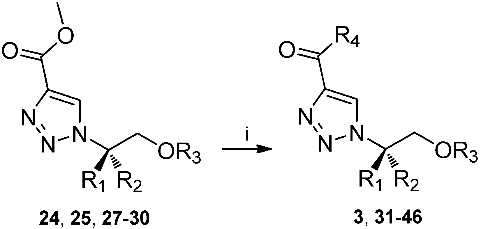 The ester functionality of the disubstituted-1,2,3-triazoles was further derivatised by reaction with primary and secondary amines. Compound 24 and 25 were reacted with 7N NH3 in MeOH for 15 h at RT and the corresponding target compounds were obtained in 97% and 93% isolated yields respectively. However, reacting 24 with other amines (3 eq) such as butylamine, benzylamine, diethylamine, morpholine or ethanolamine in MeOH, resulted in sluggish reactions. Prolonged reaction times (30 h), larger excess of amines (10 eq) or elevated temperature, either by classical thermal heating (50 oC, 10 h) or by microwave assisted heating (100 oC, 10-60 min in a sealed vessel) had only a marginal effect on the yield.