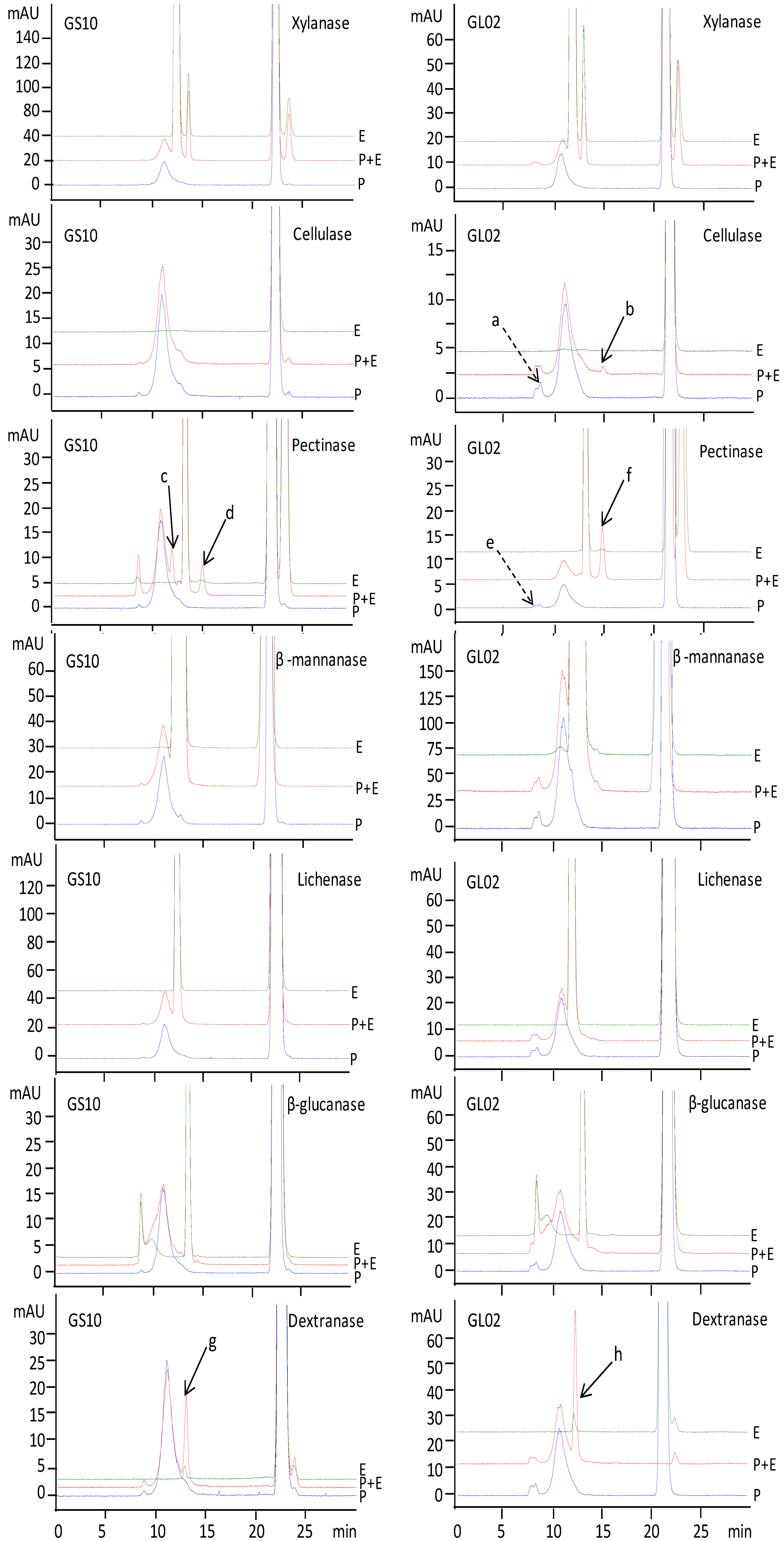 The results showed that xylanase, β-mannanase, lichenase and β-glucanase usually had no significant effect on polysaccharides from G. lucidum (GL02) and G. sinense (GS10), but pectinase (peak c, peak d and peak f) and dextranase (peak g and peak h) can certainly hydrolyze polysaccharides from GS10 and GL02. Cellulase also had an effect on polysaccharides from GL02 (peak a decreased and peak b present). The detailed responses of polysaccharides from G. sinense and G. lucidum to enzymatic digestion are summarized in Table 1. Polysaccharides from all samples of G. sinense and G. lucidum showed positive responses to enzymatic digestion. In addition, some samples had specific responses to cellulase (GL02 and GL13) and β-mannanase (GL01, GL07, GL10, GL11 and GL14).