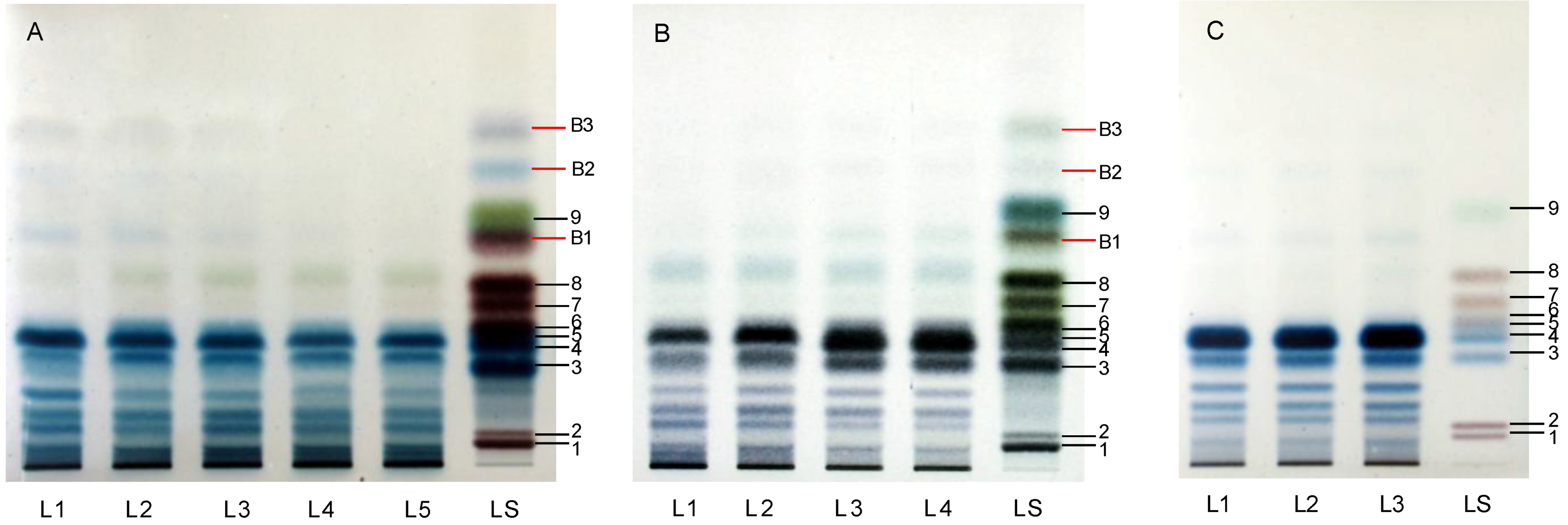 Effects of (A) concentration of TFA for 2 h, (B) hydrolysis time treated with 5 mol/L, and (C) optimum conditions (5 mol/L for 6 h) on acid hydrolysis of polysaccharides from Ganoderma lucidum (GL07). A: L1, 7 mol/L; L2, 6 mol/L; L3, 5 mol/L; L4, 4 mol/L; L5, 3 mol/L. B: L1, 2 h; L2, 4 h; L3, 6 h; L4, 8 h. C: L1, L2 and L3 were all at same optimum conditions. LS in A and B, mixed standards treated with 8 mol/L TFA for 2h; LS in C: Mixed standards of D-galacturonic acid (1), D-glucuronic acid (2), D-galactose (3), D-glucose (4), D-mannose (5), L-arabinose (6), D-xylose (7), D-ribose (8)and L-rhamnose (9).