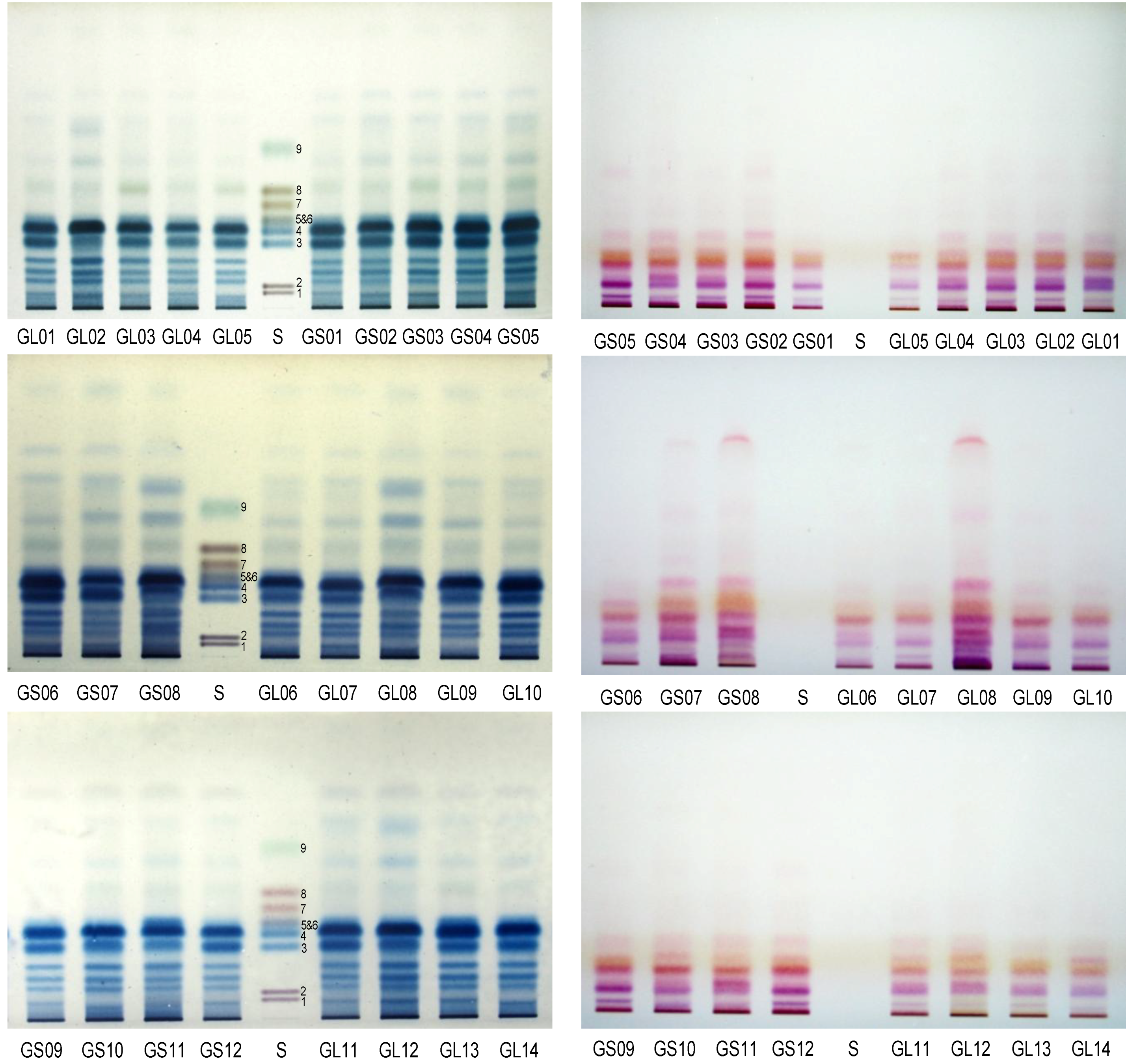 HPTLC profiles, colored with aniline-diphenylamine-phosphoric acid (Left) and ninhydrin (Right) solutions, of acid hydrolysates of polysaccharides from Linzhi. GL01-GL14 and GS01-GS12 were the same as in Section 3.1. S: Mixed standards of D-galacturonic acid (1), D-glucuronic acid (2), D-galactose (3), D-glucose (4), D-mannose (5), L-arabinose (6), D-xylose (7), D-ribose (8)and L-rhamnose (9).