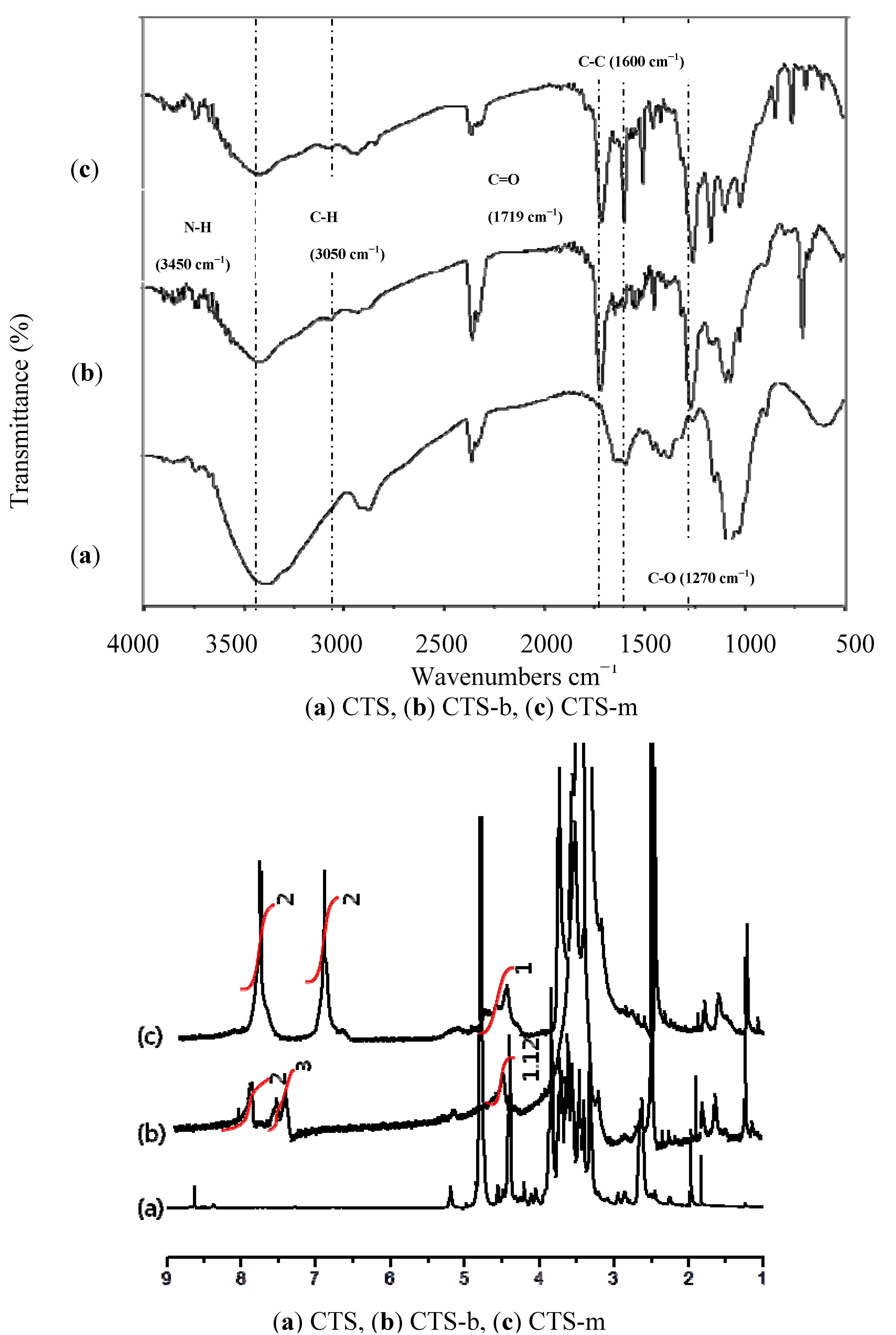 FT-IR: For the chitosan benzoate (KBr pellet): around 3,450 cm−1(N-H bonds), around 3,050 cm−1 (aromatic C–H bonds), 2,960 cm−1 (aliphatic C–H bonds), 1,710 cm−1 (aromatic ester carbonyl), 1,270 cm−1 (aromatic C-H bonds).