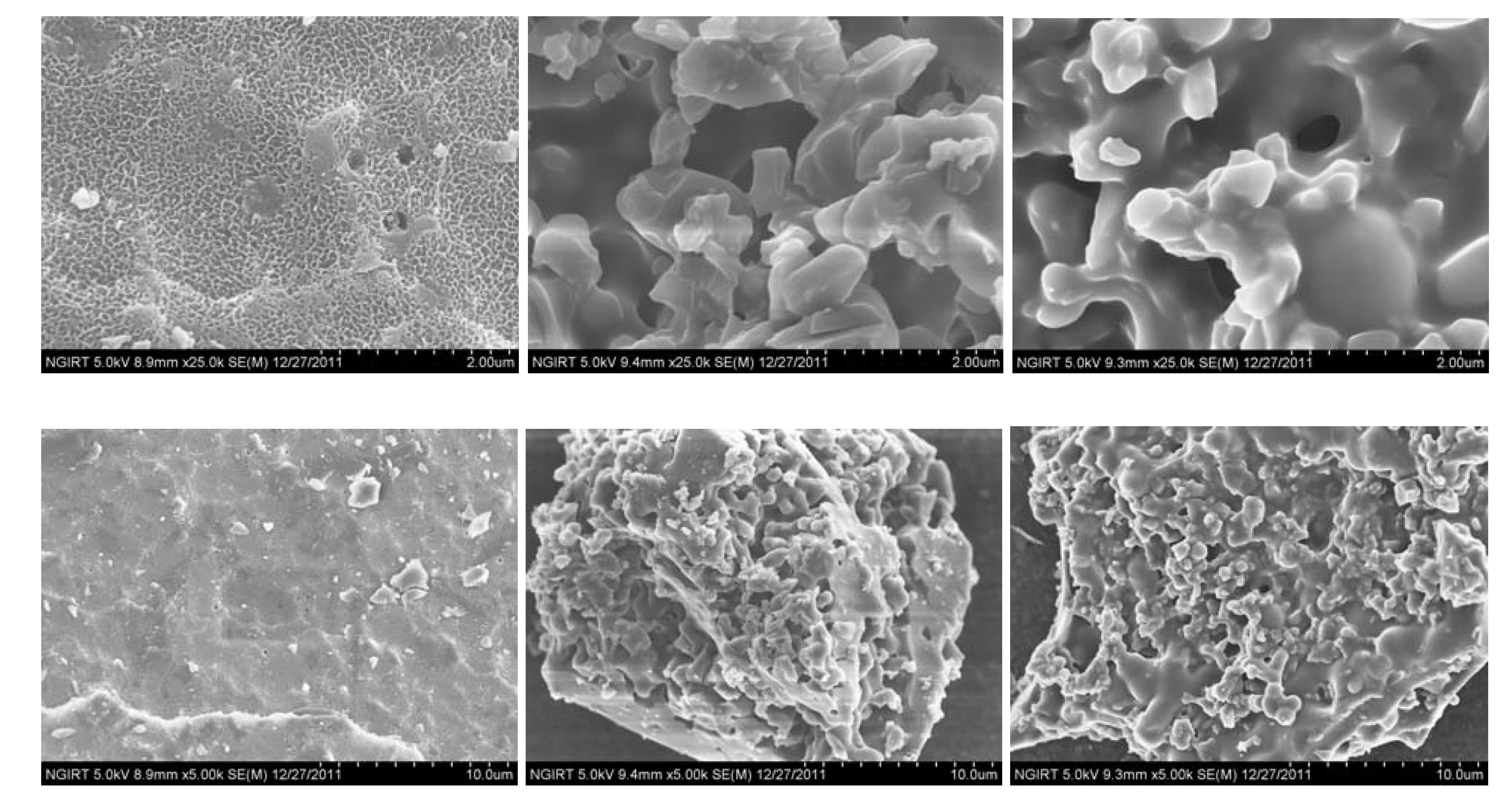 The SEM images of the parent chitosan and the synthesized benzoyl chitosans. The upper images: 25,000 times magnified images; The lower images: 5,000 times magnified images; Left: CTS; middle: CTS-b; right: CTS-m.