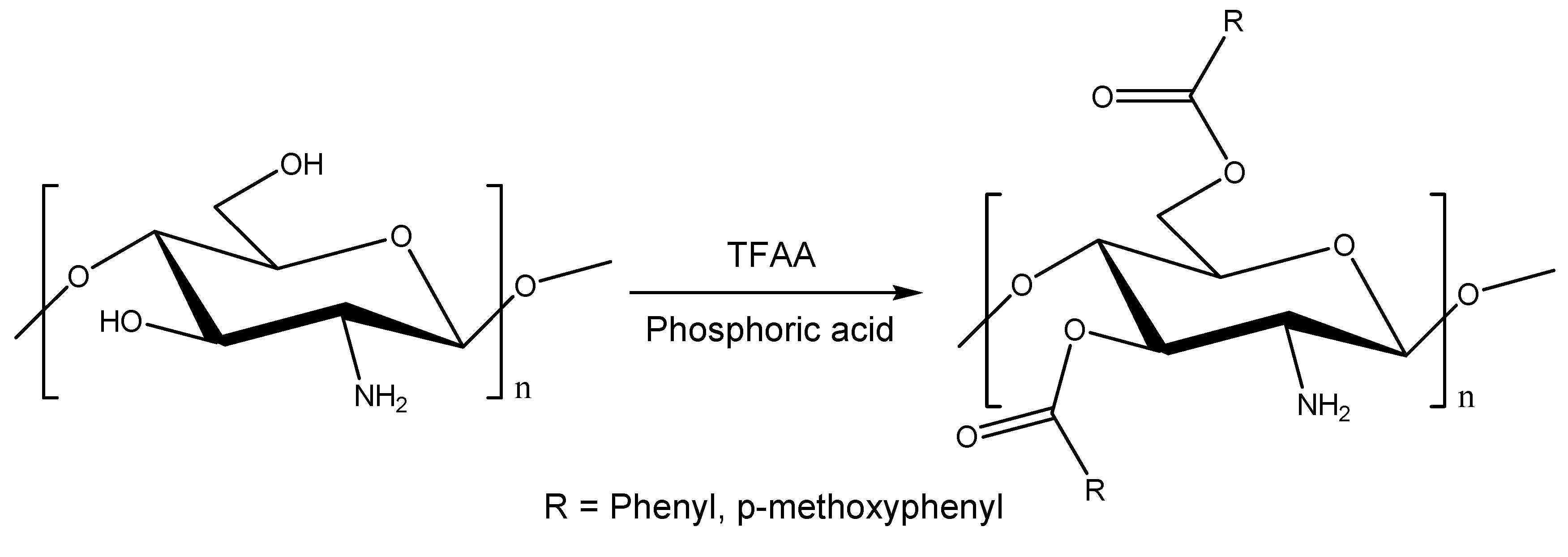 Chitosan (Mwt: below 1,000, degree of deacetylation: about 90%, moisture content: 6.8%) was purchased from the Kitto Lift (Pyeongtaek, Korea), TFAA (trifluoroacetic anhydride) from Acros Organics B.V.B.A (Geel, Antwerp, Belgium); benzoic acid and p-methoxybenzoic acid, 85% phosphoric acid from Sigma Aldrich (Yongin, Korea); dimethyl sulfoxide-d6 from Cambridge Isotope Laboratories, Inc. (Andover, MA, USA). All other chemicals are of reagent grade. The materials were used as received without further purification.