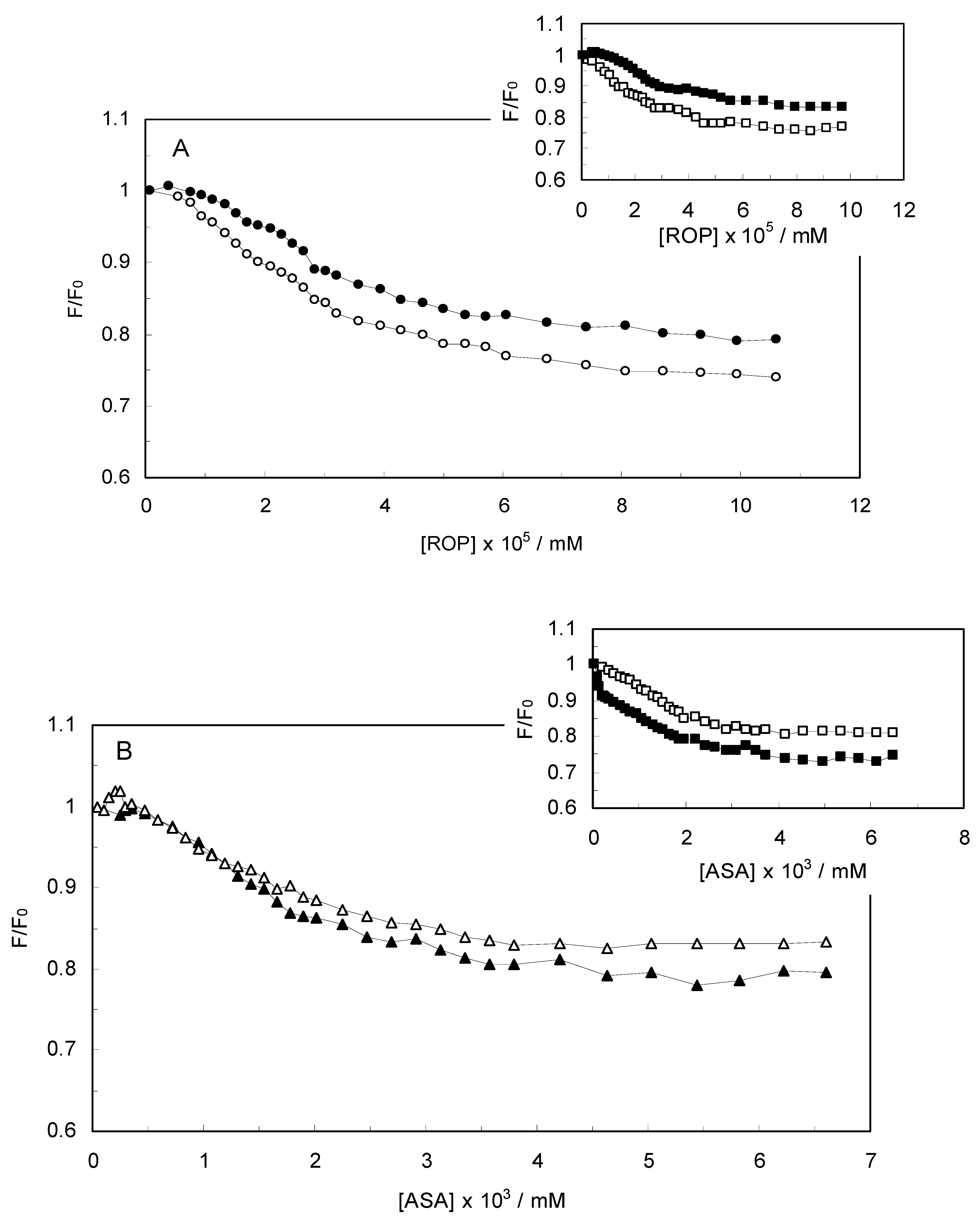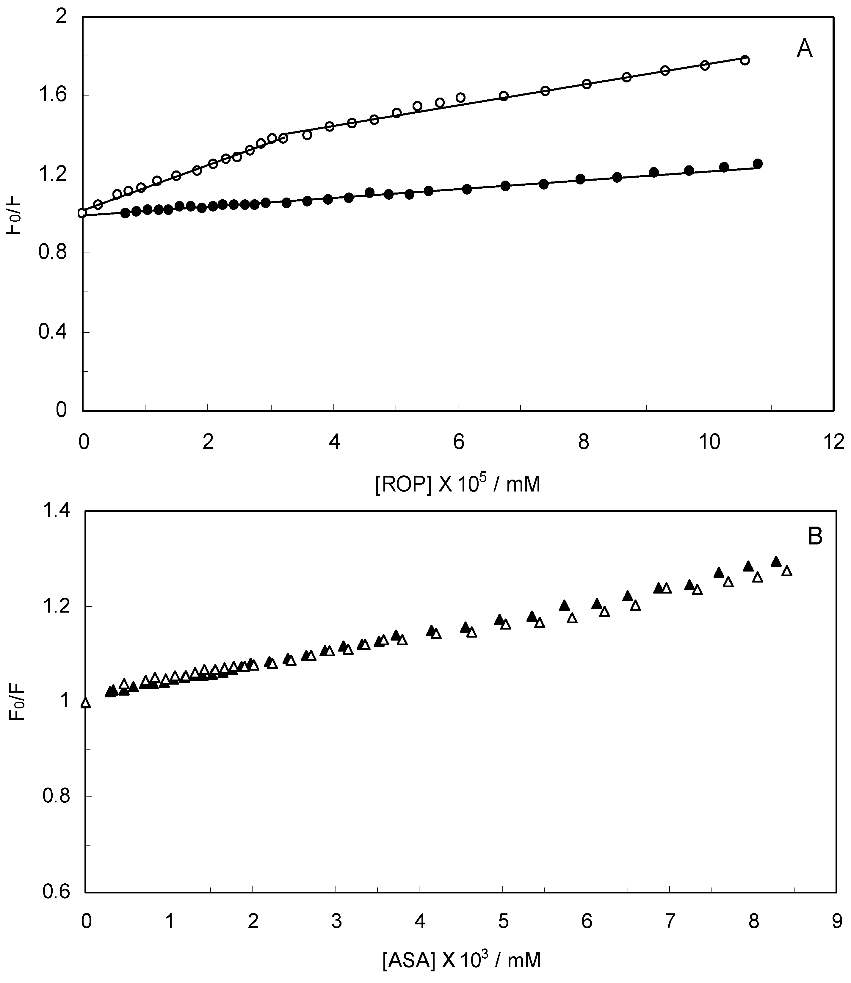 (A) Stern-Volmer plots for the binding of ROP to hTf in the absence and presence of ASA. [ASA] = 4.62 × 10−3 mM, binary system (○); ternary system (●); (B) Stern-Volmer curves for the binding of ASA to hTf in the absence and presence of ROP. [ROP] = 1.33 × 10−5 mM, binary system (∆); ternary system (▲).