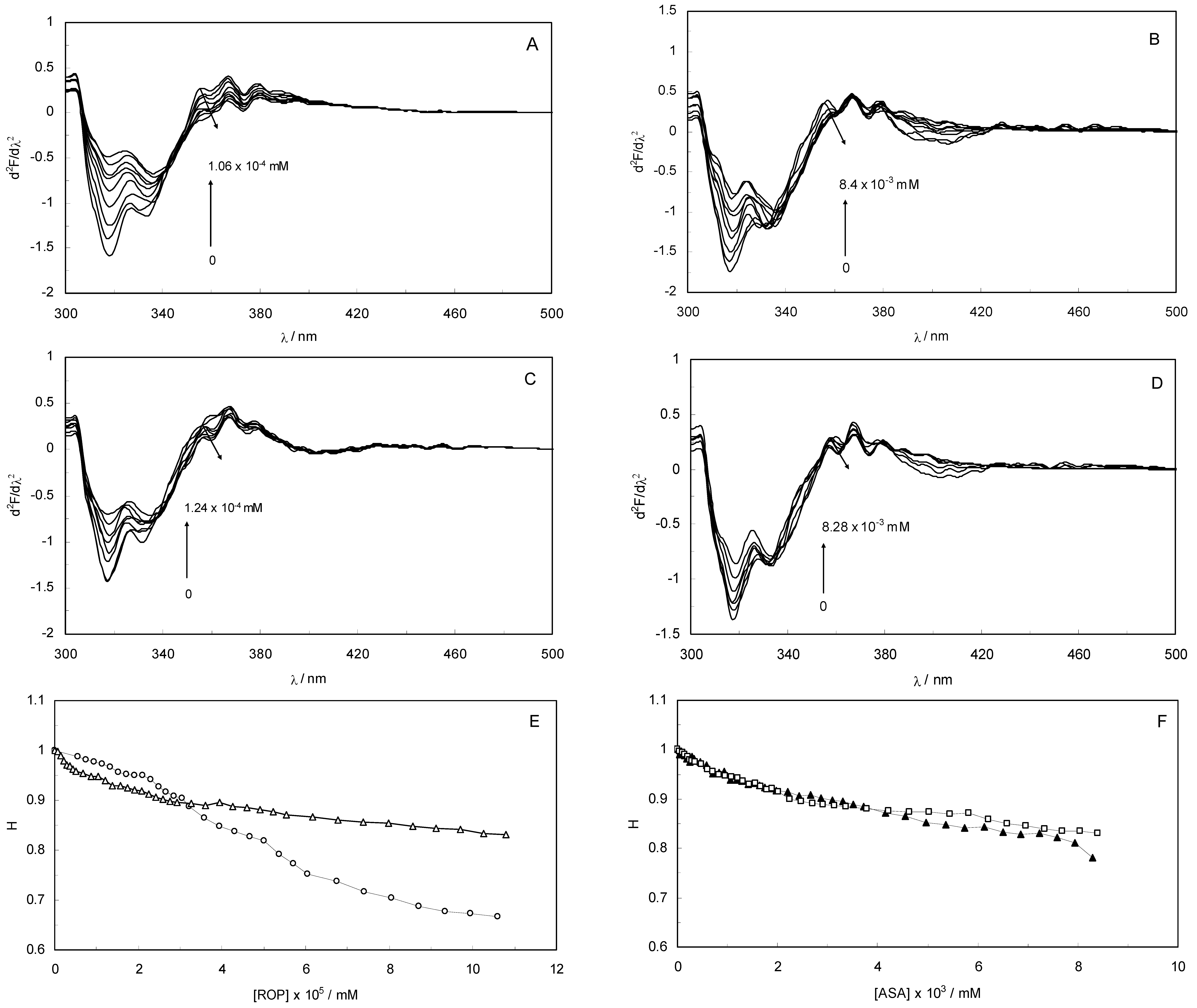 (A) The second derivative fluorescence spectra of hTf in the presence of ROP; (B) The second derivative fluorescence spectra of hTf in the presence of ASA; (C) The second derivative fluorescence spectra for the (hTf-ASA)-ROP system; (D) The second derivative fluorescence spectra for the (hTf-ROP)-ASA system; (E) A plot of the H versus [ROP] for hTf-ROP in the absence and presence ASA. Binary system (○); ternary system (∆). [ASA] = 4.62 × 10−3 mM for the ternary system; (F) A plot of the H versus [ASA] for hTf-ASA in the absence and presence ROP. Binary system (□); ternary system (▲). [ROP] = 1.33 × 10−5 mM for the ternary system.