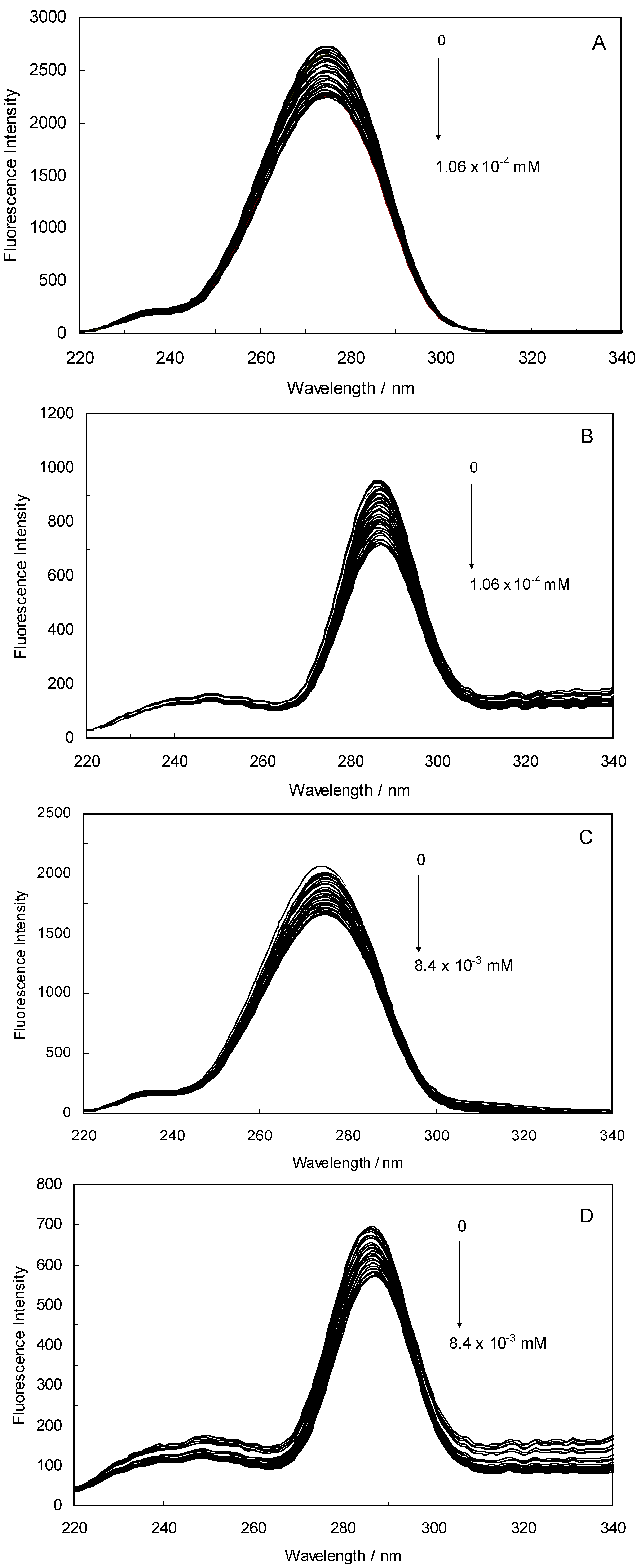 Figure 1A,B displays the fluorescence quenching of hTf induced by ROP and ASA (a single drug), excited at 280 nm. As can be seen, the fluorescence intensity of hTf gradually decreased upon increasing the concentration of ROP or ASA, indicating that the two drugs became bound to hTf. On the other hand, the emission spectra for binary systems portrayed an isobestic point, pointing at the existence of bound and free ROP and ASA in equilibrium. The quenching took place when the quencher was sufficiently close to Trp or/and Tyr residues [