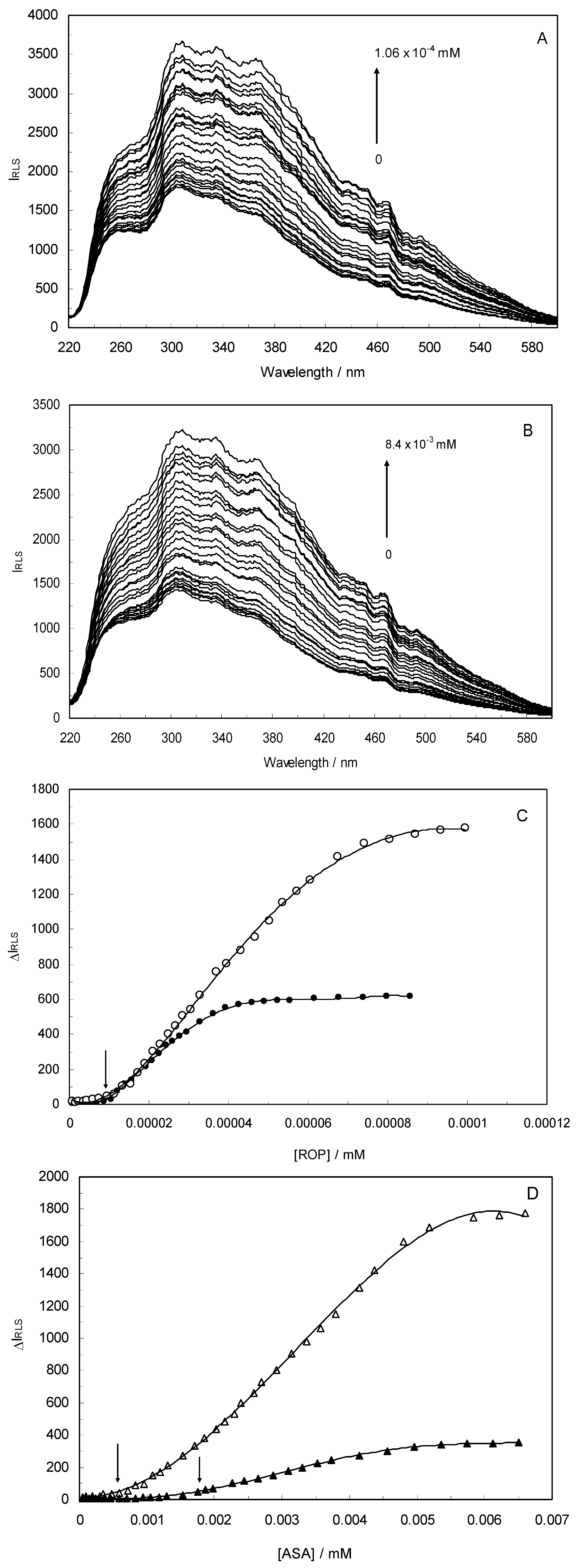 Figure 7) and it was found that the enhancement of the RLS intensity differed as a function of the concentrations of ROP and ASA. When the ROP and ASA concentrations were too low, the RLS intensity of the binary and ternary systems hardly changed. However, with increasing ROP and ASA concentrations, the RLS intensity of these systems gradually increased, and precipitation was even observed to occur in the solutions containing high concentrations of drugs.