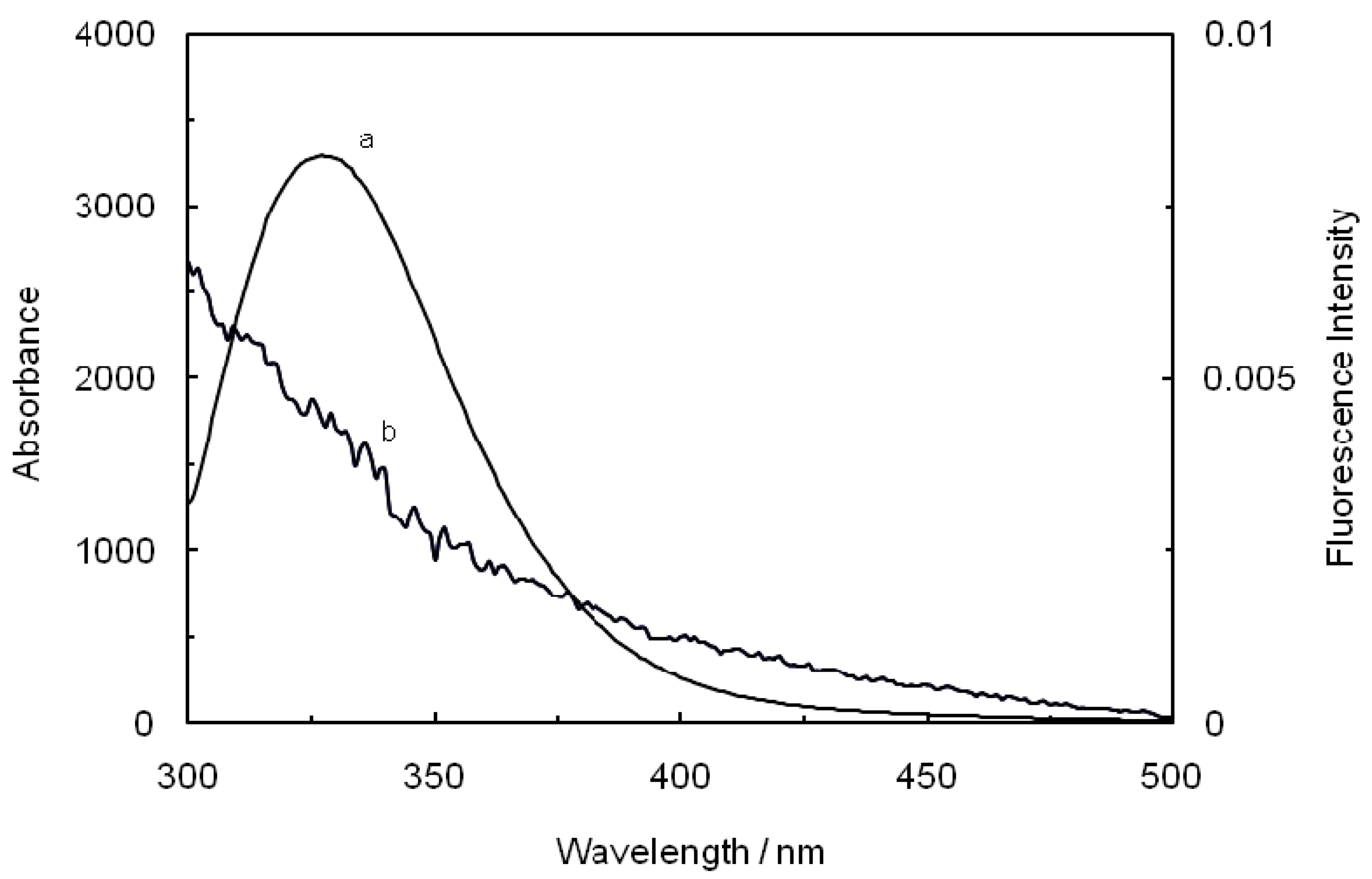 Spectral overlap of the fluorescence spectra of hTf in the presence of ASA (a) with the absorption spectra of ROP (b) at pH 7.4 and T = 298 K. [hTf] = 3.8 × 10−3 mM, [ASA] = 4.6 × 10−3 mM and [ROP] = 7.27 × 10−5 mM.