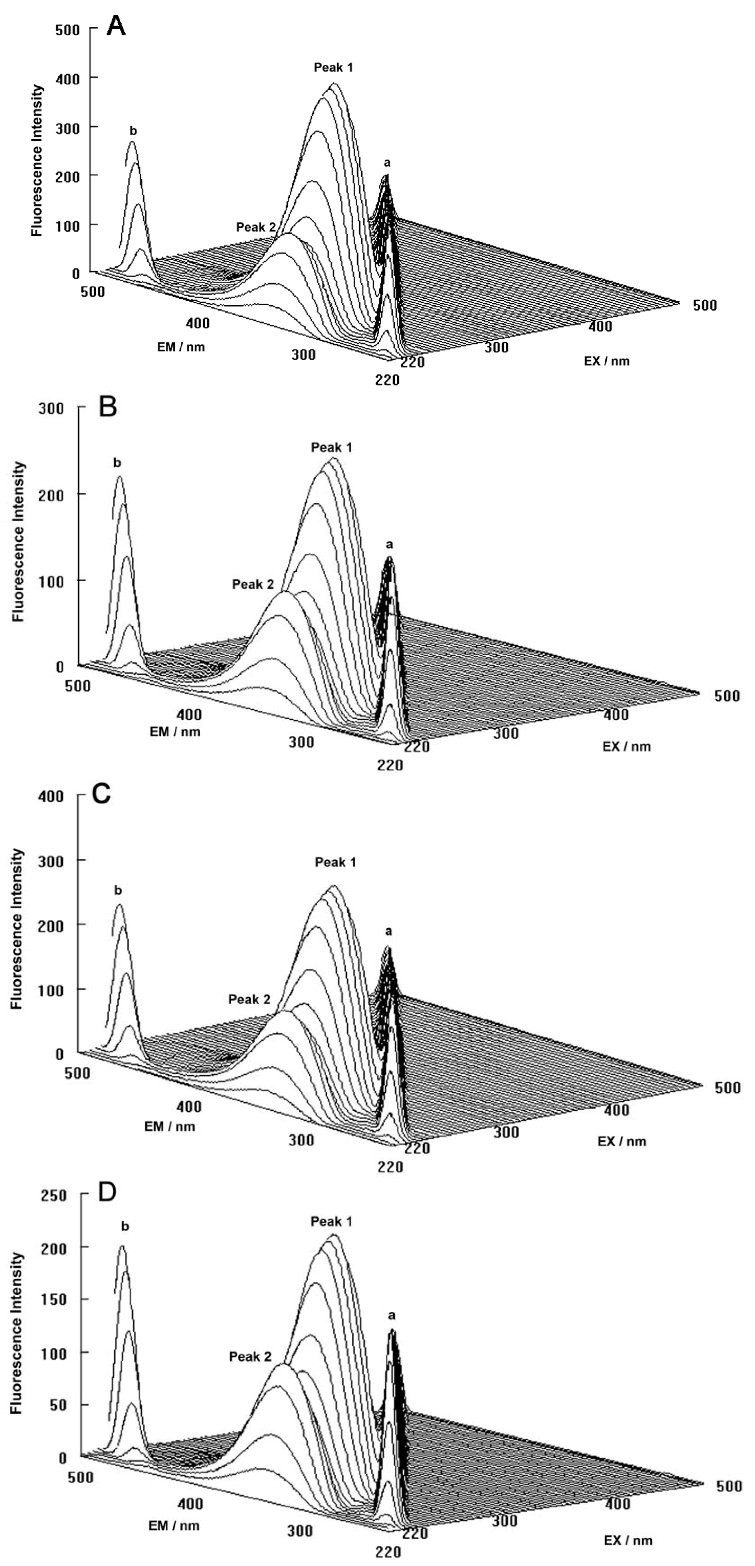 The three-dimensional fluorescence spectra and the contour maps for both the binary and ternary systems are shown in