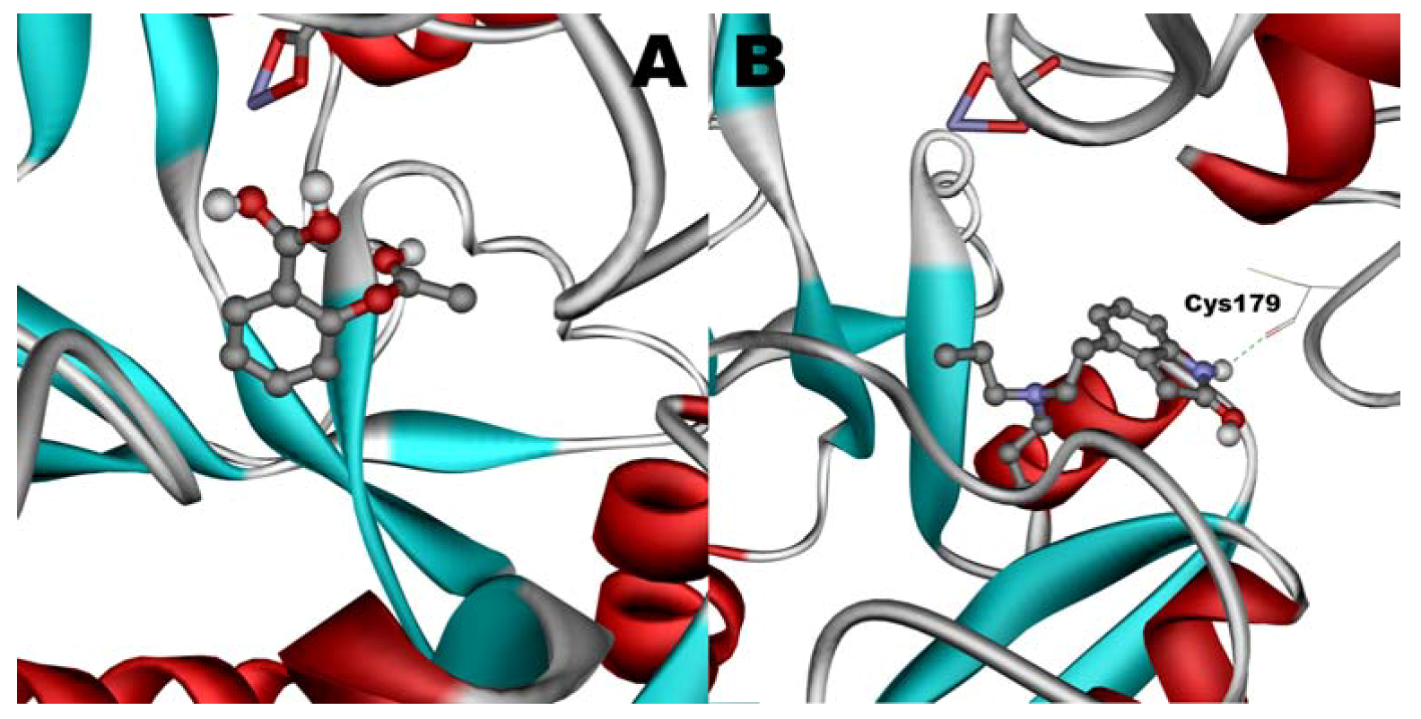 When docked alone, ROP formed a hydrogen bond to Cys179 and properly fits the binding pocket (