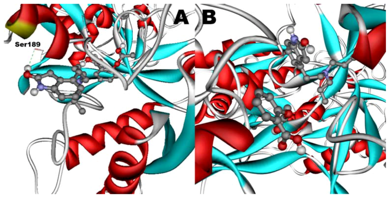 Figure 11B). However, when introduced to the hTf-ASA complex, it could not attach to pocket in the same orientation; and created instead a hydrogen bond to Ser189 (
