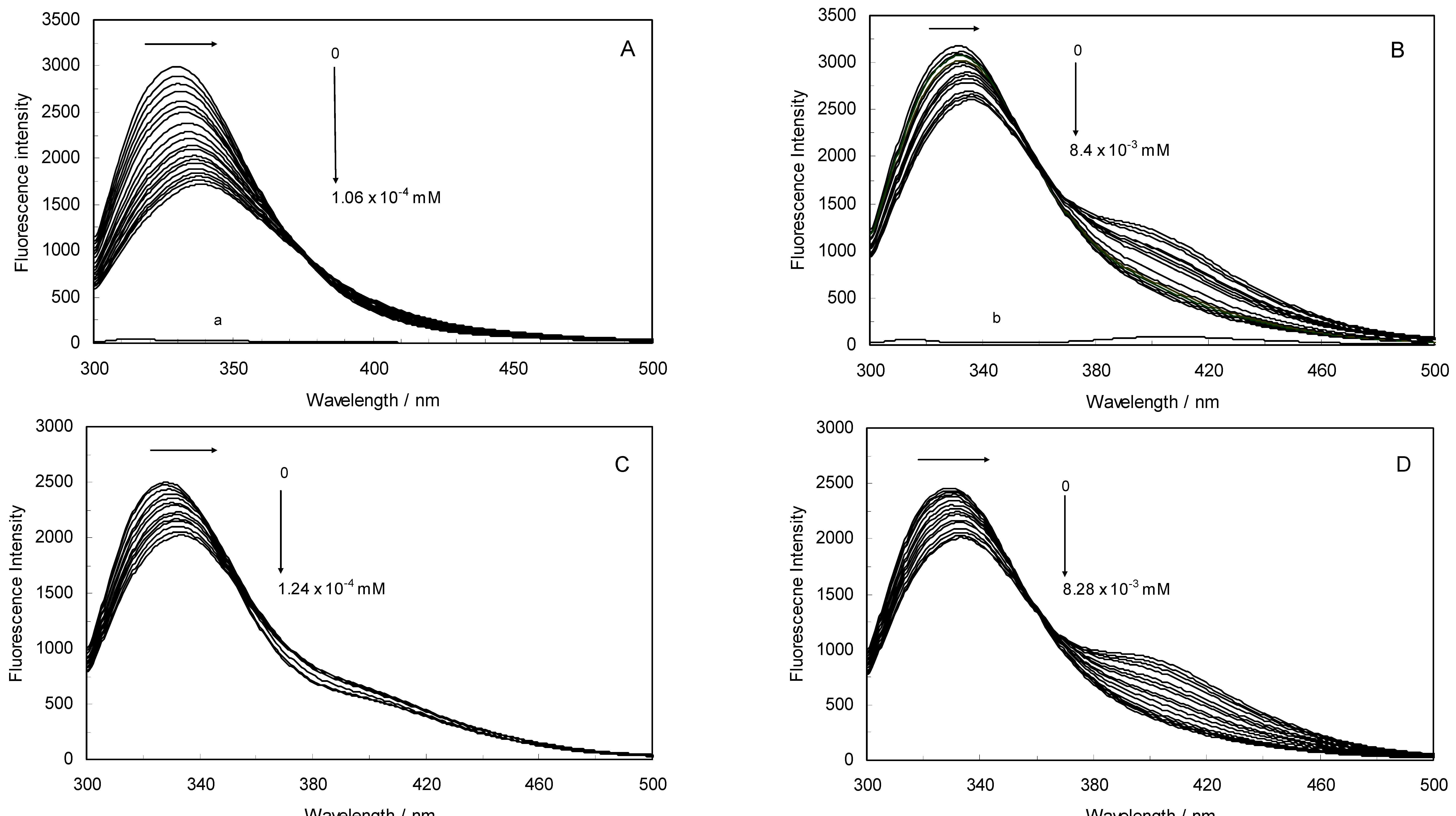 (A) Fluorescence emission spectra of the hTf-ROP system. [hTf] = 3.8 × 10−3 mM and [ROP] was increased from 0 to 1.06 × 10−4 mM; (B) Fluorescence emission spectra of the hTf-ASA system. [hTf] = 3.8 × 10−3 mM and [ASA] was increased from 0 to 8.4 × 10−3 mM; (C) Fluorescence emission spectra of the (hTf-ASA)-ROP system. [hTf] = 3.8 × 10−3 mM and [ROP] was increased from 0 to 1.24 × 10−4 mM, [ASA] = 4.62 × 10−3 mM; (D) Fluorescence emission spectra of the (hTf-ROP)-ASA system. [hTf] = 3.8 × 10−3 mM and [ASA] was increased from 0 to 8.28 × 10−3 mM, [ROP] = 1.33 × 10−5 mM. The a and b represent the curves of ROP and ASA, respectively. All experiments were performed under identical conditions (T = 298 K; pH 7.4, λex = 280 nm). The horizontal arrow shows the red shift.