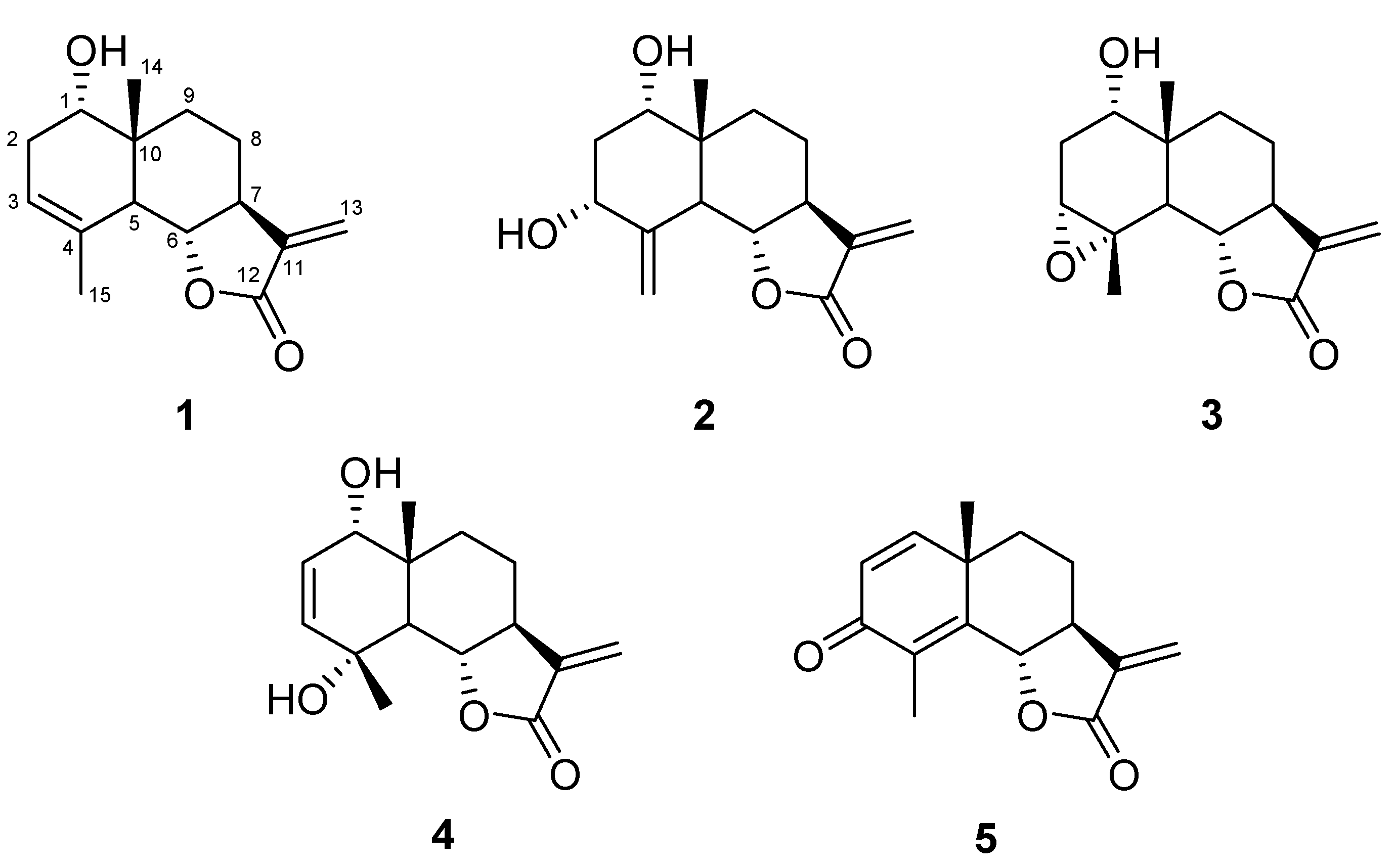 Ludovicin A (3): data previously reported [22]. 13C-NMR (CDCl3) δ: 18.1 (q, C-14), 21.0 (t, C-8), 22.3 (q, C-15), 29.1 (t, C-2), 33.1 (t, C-9), 40.1 (s, C-10), 46.0 (d, C-5), 50.8 (d, C-7), 59.0 (s, C-4), 60.8 (d, C-3), 73.2 (d, C-1), 81.0 (d, C-6), 117.2 (t, C-13), 138.5 (s, C-11), 170.4 (s, C-12).