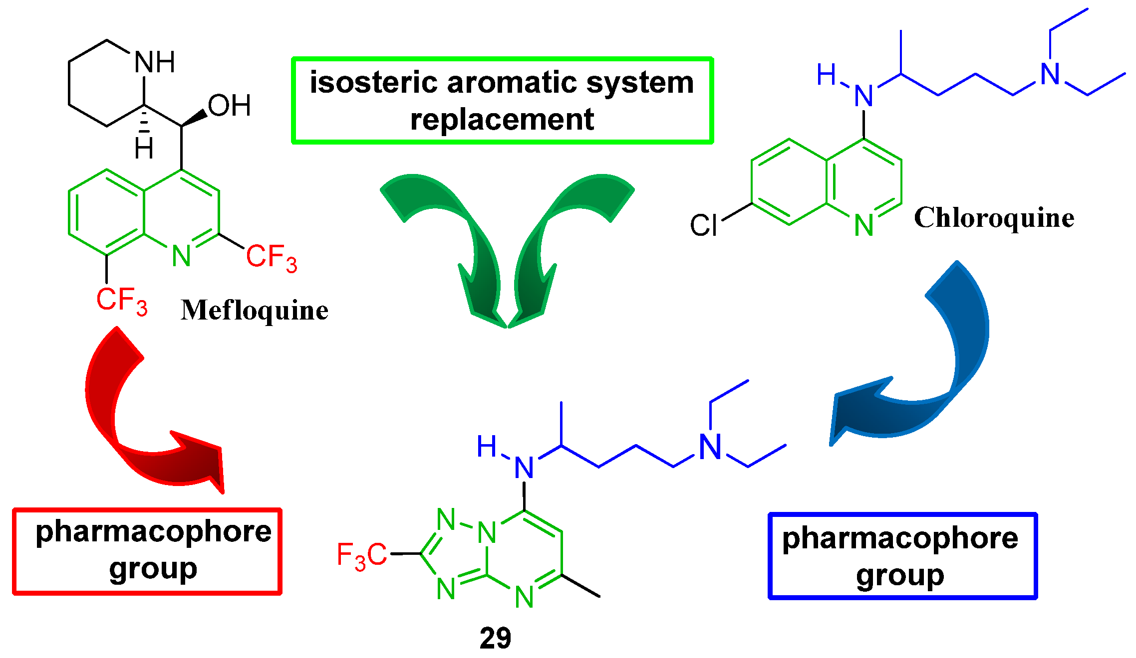 Strategy used in 2004 to obtain 5-methyl-7-N'-(N,N-diethylpentane-1,4-diamine)-2-(trifluoromethyl)[1,2,4]triazolo[1,5-a]pyrimidine (29) as an antimalarial bioisostere of quinoline.