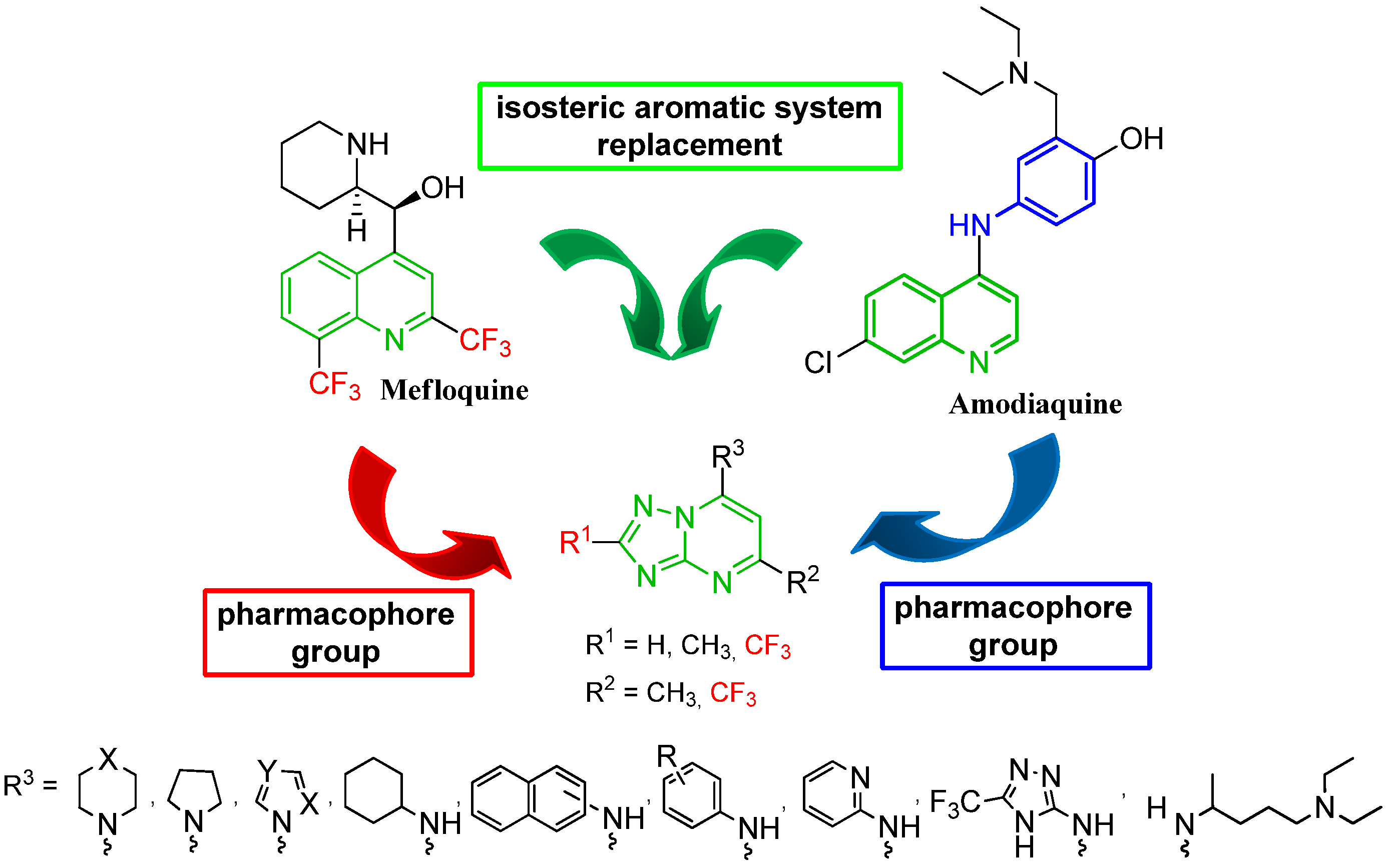 Many heterocyclic compounds have been developed in an attempt to find new drugs to treat malaria [13,14,15,16,17,18,19,20,21,22]. In 2004, our research group described the synthesis of 5-methyl-7-N'-(N,N-diethylpentane-1,4-diamine)-2-(trifluoromethyl)[1,2,4]triazolo[1,5-a]pyrimidine derivatives [23,24]. These compounds contained a trifluoromethyl group on the [1,2,4]triazolo[1,5-a]pyrimidine as a ring bioisostere of mefloquine and N1,N1-diethylpentane-1,4-diamine to mimic the chloroquine pharmacophore (Figure 1). However, these compounds showed poor antimalarial activity. Phillips and co-workers recently confirmed our proposal, demonstrating that [1,2,4]triazolo[1,5-a]pyrimidines inhibit P.falciparum dihydroorotate dehydrogenase (PfDHODH) and kill the parasite [25,26,27,28,29].