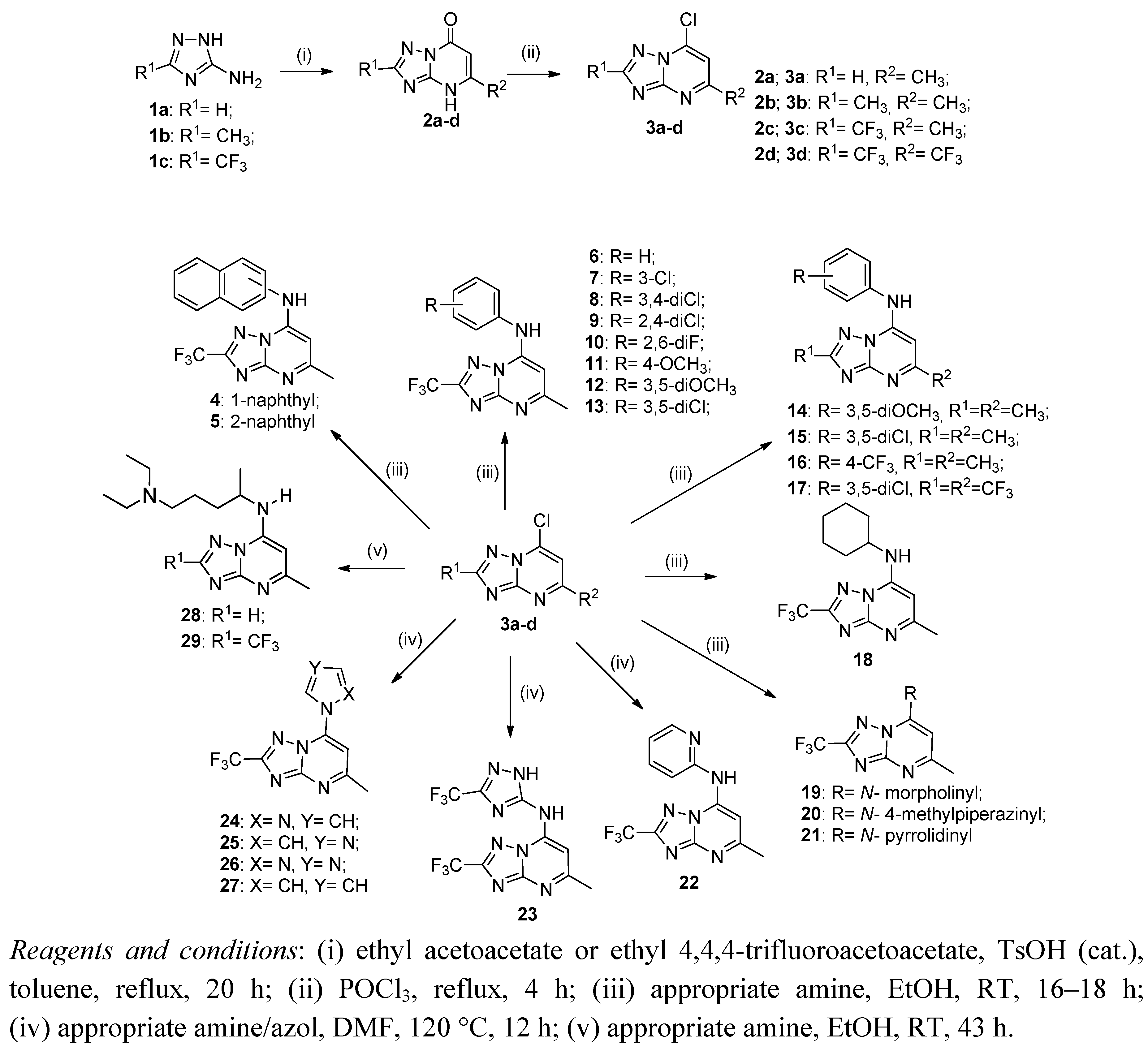 The synthetic route to [1,2,4]triazolo[1,5-a]pyrimidine derivatives 4–29 is shown in Figure 3. Condensation of 3-amino-1,2,4-triazoles 1a–c with ethyl acetoacetate or ethyl 4,4,4-trifluoroacetoacetate in refluxing toluene, in the presence of catalytic p-toluenesulfonic acid, gave [1,2,4]triazolo[1,5-a]pyrimidin-7(4H)-ones 2a–d in 50–90% yields after 24 h, as previously described in the literature [23,24,30,31]. Spectroscopic data of compounds 2a–d were in agreement with the literature, and X-ray crystallography showed 2c as their keto-tautomers [24]. Compounds 2a–d were easily chlorinated with phosphorus oxychloride under reflux for 6 h, affording the respective 7-chloro[1,2,4]triazolo[1,5-a]pyrimidines 3a–d in 58–90% yields. Compounds 3a and 3b showed identical spectroscopic data to those reported in the literature [23,25,26,27,28,29,30,31]. Spectroscopic data of compounds 3c and 3d were in agreement with the proposed structures. Reaction of compounds 3a–d with several amines produced the target compounds 4–29 in 30–90% yields.