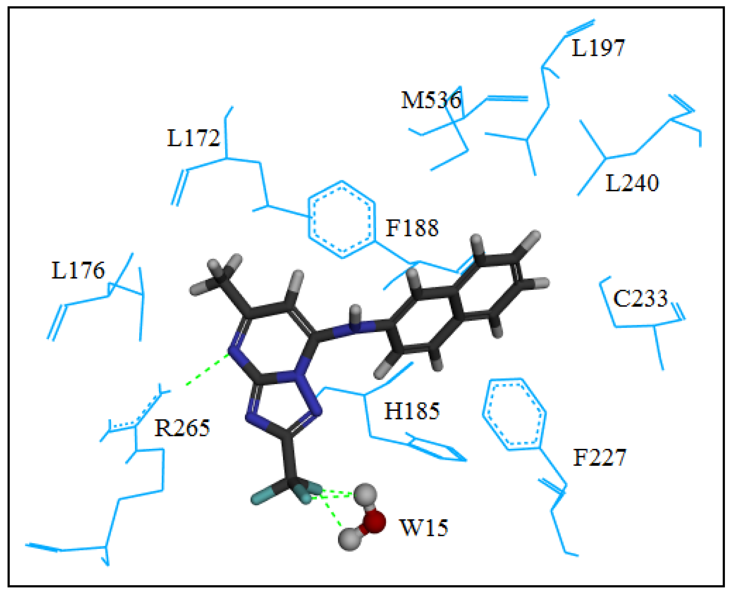 Enzyme residues H185 and R265 and the water molecule W15 found in the crystal structure of PfDHODH act as “molecular anchors” for binding molecules 4–29 at the active site. Such “anchors” are actually hydrogen bonds formed between 4–29 and the enzyme residues or the water molecule. Each [1,2,4]triazolo[1,5-a]pyrimidine 4–29 interacts with R265 by forming a hydrogen bond through N-4. An additional hydrogen bond can be present between N-1 of the pyrimidine ring and H185. The frequency with which hydrogen bonds are formed between the W15 molecule and CF3 groups at the 2-position of [1,2,4]triazolo[1,5-a]pyrimidine rings of the majority of compounds was remarkable. Twenty-two of the 26 synthesized compounds (compounds 4–13, 17–27, 29) showed the CF3–W15 interaction. Consequently, the CF3 group must be carefully considered for the development of potential new lead inhibitors of PfDHODH. Figure 4 shows the R265–N-4 and the CF3–W15 interactions.