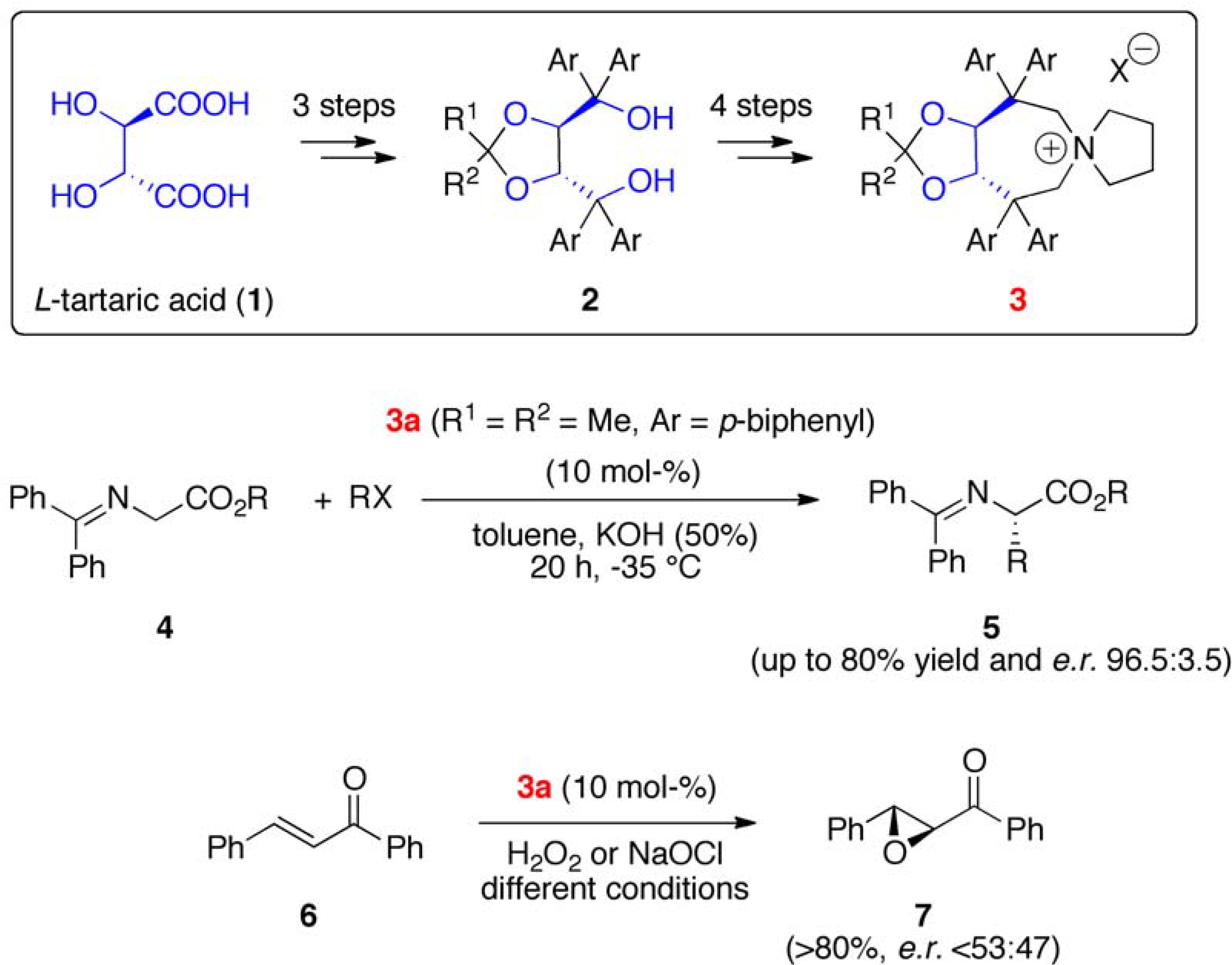 One of the main demands for novel catalysts is easy accessibility from readily available chiral starting materials. Among the easily available natural chiral sources, tartaric acid (1) has obtained a prominent position, especially due to the fact that both enantiomers are readily available in sufficient quantities. Although Shibasaki et al. have demonstrated the potential of tartaric acid-derived bidentate PTCs [36,37,38], others were less successful in their attempts to synthesize powerful tartaric acid-derived quaternary ammonium salt catalysts [41,42]. Based on the high potential of tartaric acid-derived easily obtainable tetraaryl-2,2-dimethyl-1,3-dioxolan-4,5-dimethanols (TADDOLs, 2) as chiral ligands in (transition-) metal catalysis [46,47] we have recently carried out systematic investigations to use this unique structural motive for the syntheses of chiral N-spiroquaternary ammonium salt catalysts [48,49]. After a careful route development we were able to obtain more than 30 differently substituted C1- or C2-symmetric N-spiro catalysts 3. The catalytic potential of these PTCs was initially tested for the benchmark α-alkylation of glycine Schiff base 4 and the p-biphenyl containing acetonide-based catalyst 3a turned out to be the most powerful one therein, giving access to a variety of amino acid derivatives 5 in high yields and with satisfying enantioselectivities (Scheme 1). In contrast, testing this catalyst for the asymmetric epoxidation of chalcone 6 resulted in the formation of racemic 7 only [49].