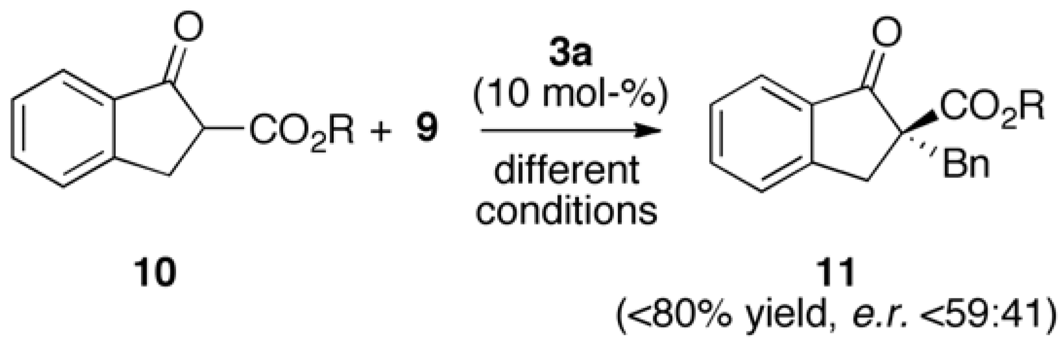 As we have recently proven the high potential of our catalysts for asymmetric α-alkylation reactions of glycine Schiff bases we also tested their applicability for the asymmetric α-alkylation of β-keto esters. As a test reaction we choose the benzylation of esters 10 under a variety of different liquid/liquid or liquid/solid phase-transfer conditions (Scheme 3). Unfortunately, after an extensive screening of a variety of different conditions and also differently substituted esters 10 we were not able to obtain the products 11 with any reasonable enantiopurity. In contrast, the non-catalysed racemic background alkylation of this highly acidic starting material was found to be the dominating reaction therein. Thus, it seems reasonable that formation of the required chiral ion pair between the ammonium salt catalyst and the enolate of 10 is too slow compared to the non-catalysed racemic background reaction, thus explaining the low enantioselectivities observed in this specific test reaction.