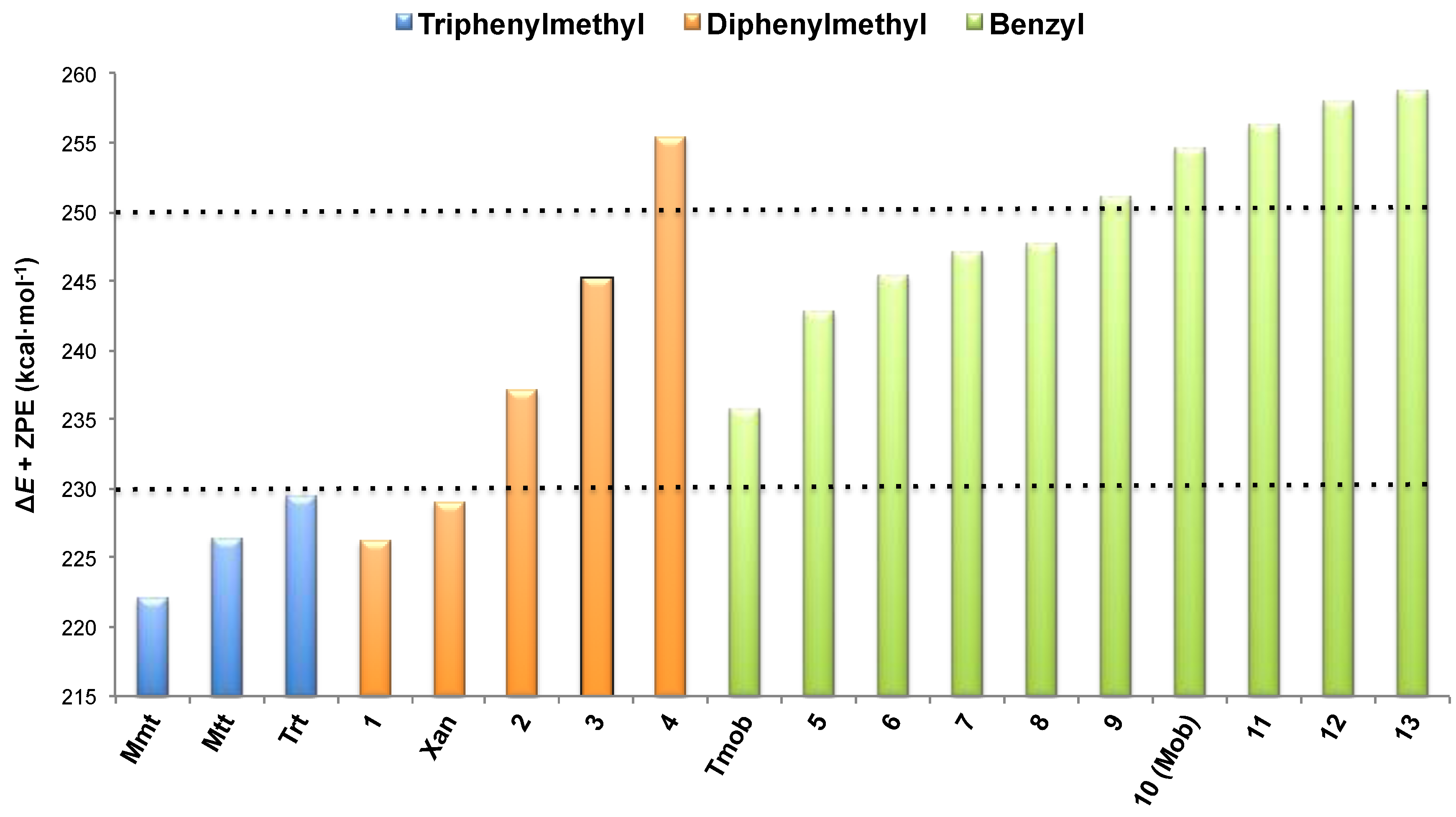 In order to explain the variations in lability of these protecting groups as well as that of others described in the literature [methoxytrityl (Mmt), methyltrityl (Mtt), trityl (Trt), xanthenyl (Xan)] [4,14,15,16,17,18], here we performed a computational study to analyze the stability of the corresponding carbocation species. This measure of stability was expressed by the total electronic energy difference (ΔE) between the carbocation (R+) and its neutral precursor (R-H) in the following reaction [19,20]: