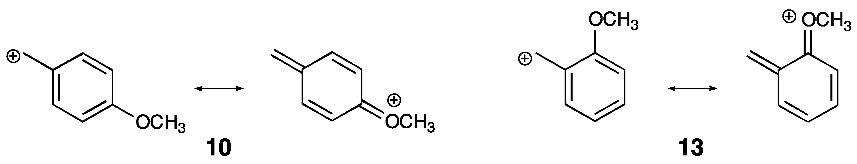 Furthermore, the stability of the cationic species is determined not only by the electronic character of any substituents present, but also by their relative position in the aromatic ring. Thus, the electron-donating substituents in ortho- and para-positions should further stabilize the cationic system through a resonance effect and have a much smaller influence in the meta-position [12].