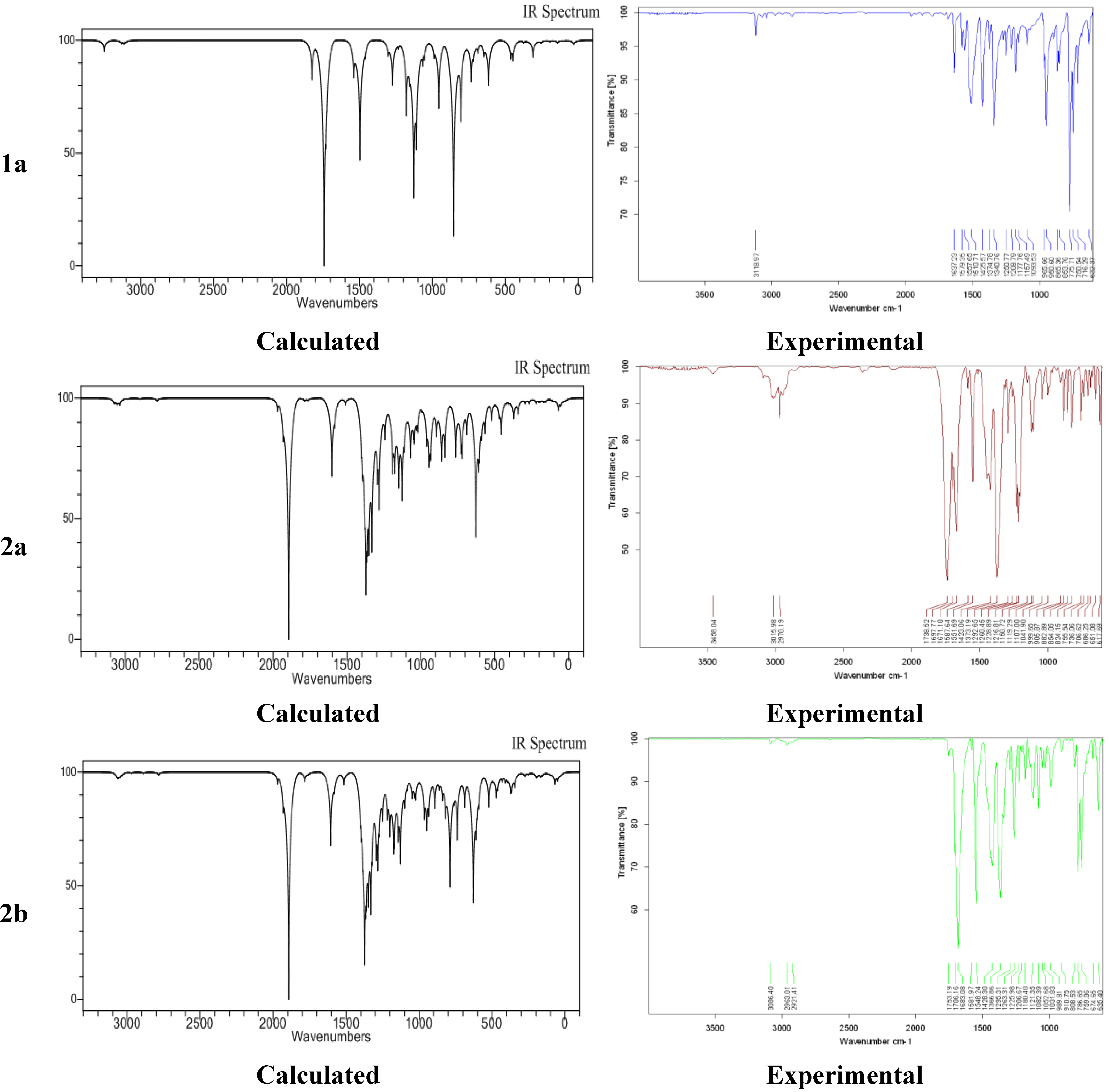 Experimental and calculated IR spectra for 1a and 2a,b.