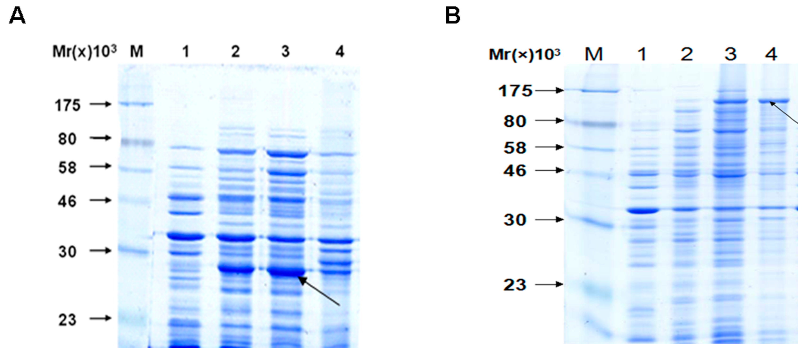 Identification of the fusion proteins apyrase-HIS/VirG-S by SDS-PAGE. (A/B) Line M: molecular weight marker: 175, 80, 58, 46, 30 and 23 kDa; Line 1: whole bacteria before induction; Line 2: whole bacteria after induction; Line 3: supernatant of the ultrasound crushing; Line 4: precipitate of the ultrasound crushing. Notes: (A) Analysis expression of apyrase protein; (B) Analysis expression of VirG protein.