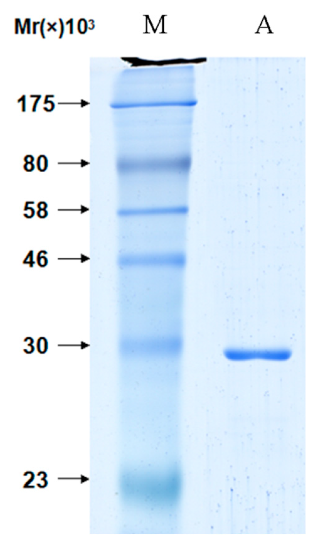 The purified protein apyrase was identified by SDS-PAGE. Line M: molecular weight markers: 175, 80, 58, 46, 30, 23 and 17 kDa; Line A: the purified apyrase protein.