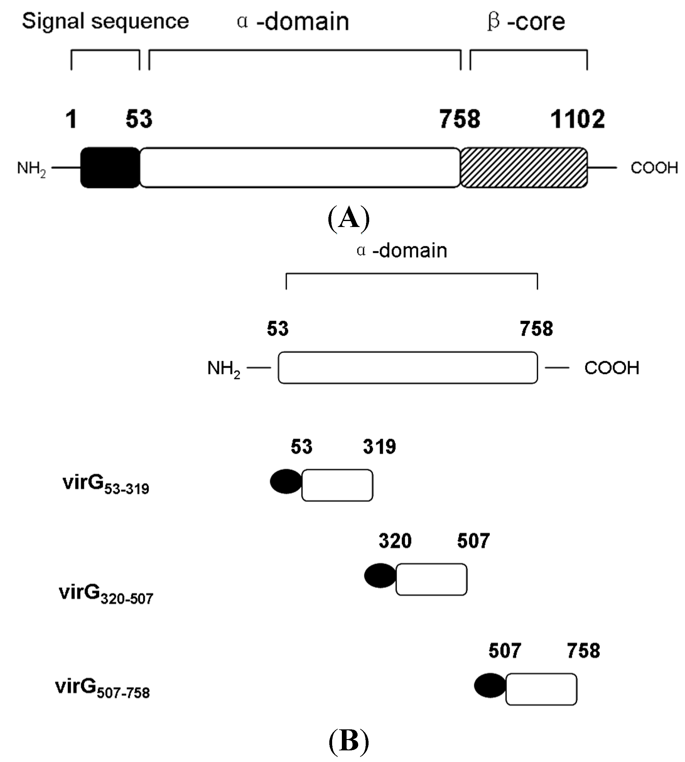 VirG is a surface-exposed outer membrane protein composed of 1102 amino acids which contains three distinctive domains: the N-terminal signal sequence (residues 1 to 52), the 706-amino acid α-domain (residues 53 to 758), and the 344-amino acid C-terminal β-core (residues 759 to 1102) [7] (Figure 5A).