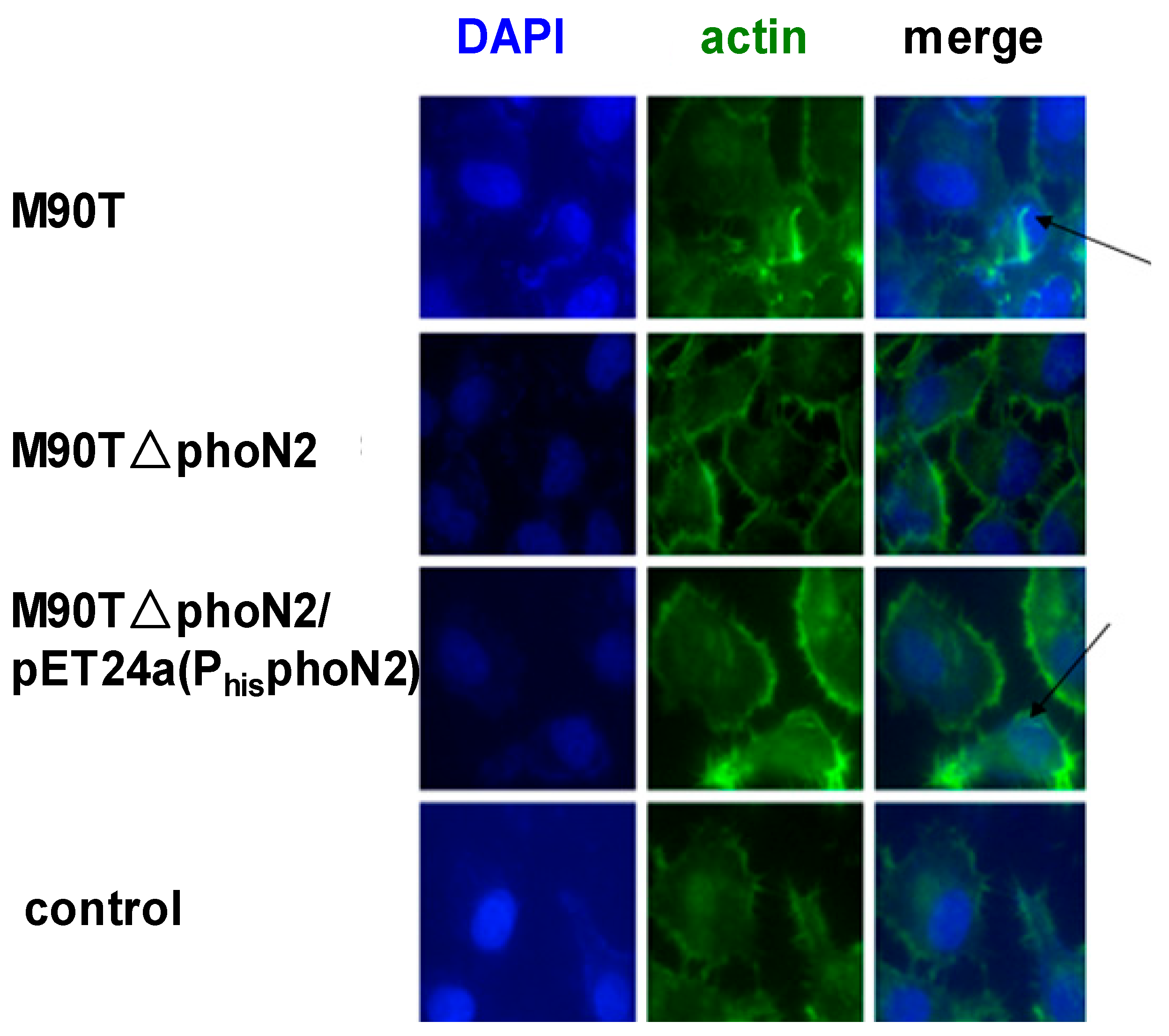 Hela cells were grown on 15.6 mm glass-bottom dishes for 24 h and infected with Shigella wild-type, ΔphoN2, ΔphoN2/pET24a (PhisphoN2) and controlled at a multiplicity of infection (moi) of 100. The infected cells were centrifuged (3000 rpm for 1 min at 37 °C) and incubated at 37 °C/5% CO2 for 1 h. Then cells were washed three times with PBS and incubated at 37 °C/5% CO2 for 3.5 h. After incubation, the infected cells were fixed using a conventional method (4% paraformaldehyde). The fixed cells were used for immunofluorescence. Samples were visualized on a Nikon Ti-u system (Nikon, Osaka, Japan) and images were analyzed. Nuclei were visualized with DAPI staining; actin was stained for F-actin.