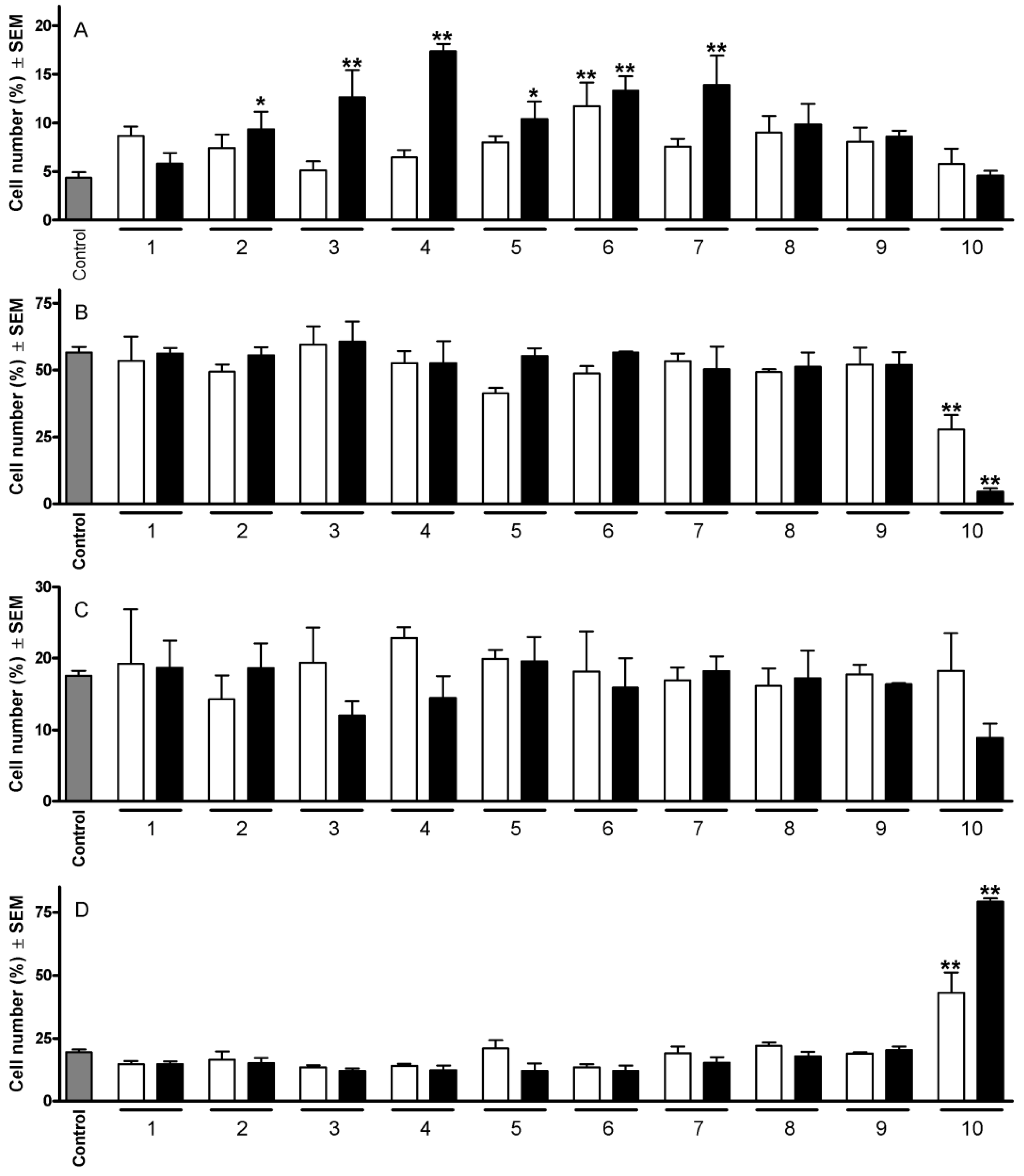 Effects of 1–10 on the HeLa cell cycle distribution after 24 h at 10 (open columns) and 30 µM (filled columns). Panels A, B, C and D indicate cells in subG1, G1, S and G2/M phase, respectively. * and ** indicate p < 0.05 and p < 0.001, respectively, as compared with the control cells.