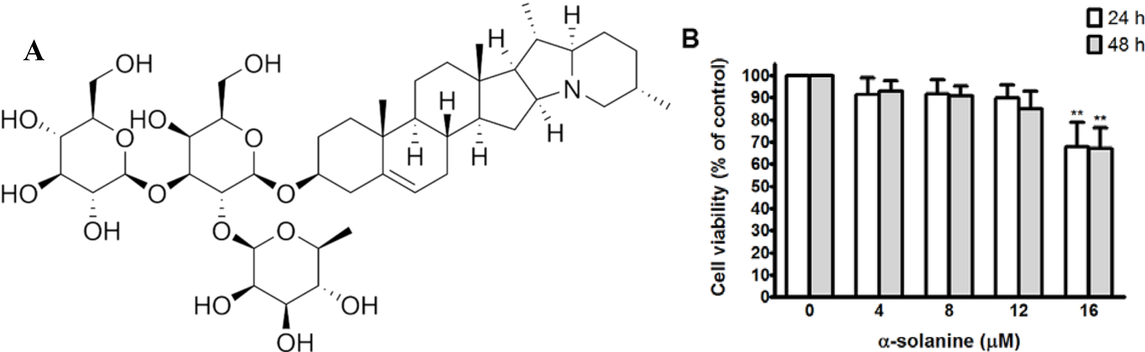 (A) Chemical structure of α-solanine. (B) Effect of α-solanine on viability of PC-3 cell. Cells were treated with various concentrations of α-solanine for 24 h and 48 h. Cell viability is presented as mean ± S.D. of four independent experiments. ** p < 0.01 compared with the untreated control.