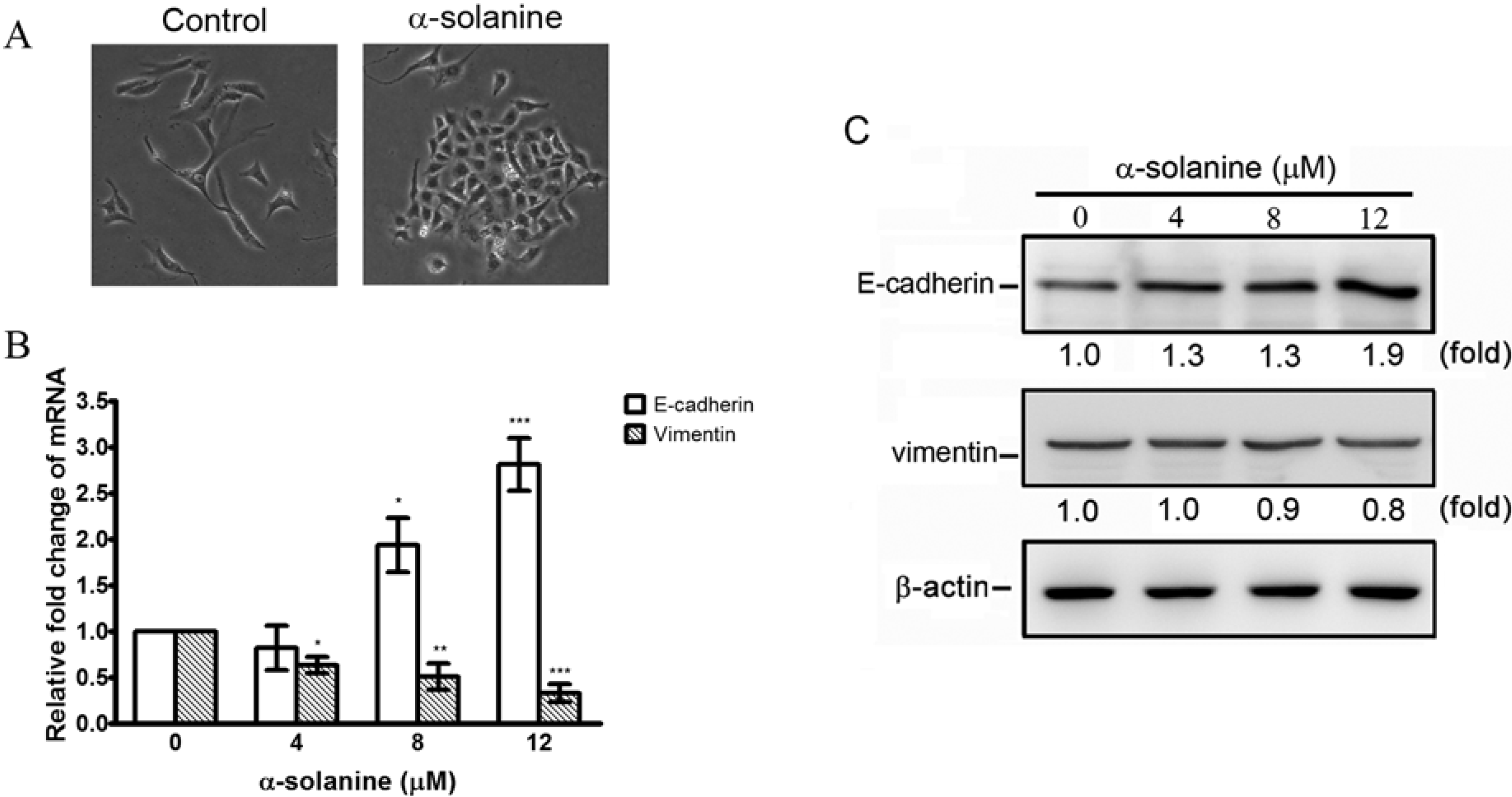 Regulation of epithelial-mesenchymal transition by α-solanine in PC-3 cell. (A) Cells were treated with 12 μM of α-solanine for 48 h and cell morphology were photographed (100× magnification). Cells were treated with various concentrations of α-solanine for 24 h and the expressions of E-cadherin and vimentin mRNA (B) and protein (C) were analyzed by quantitative real-time PCR and Western blotting, respectively. Data are expressed as mean ± S.D. of three independent experiments. * p < 0.05, ** p < 0.01, *** p < 0.001 compared with the untreated control.