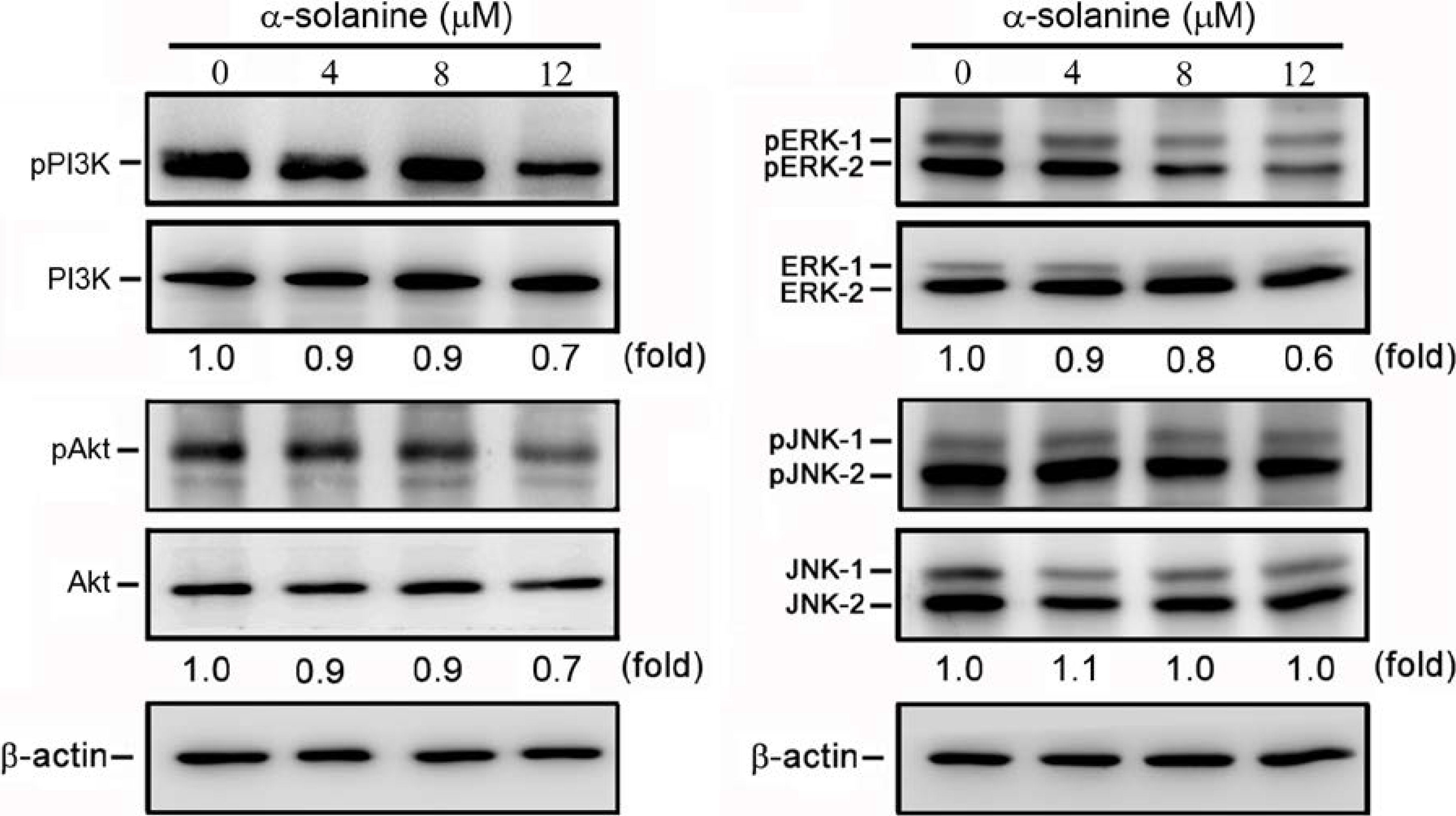 Effects of α-solanine on phosphorylation of PI3K, Akt, ERK1/2 and JNK1/2. Cells were treated with solanine for 24 h and the phosphorylation of PI3K, Akt, ERK1/2 and JNK1/2 were determined by SDS-PAGE and western blotting. β-actin was used as a loading control.