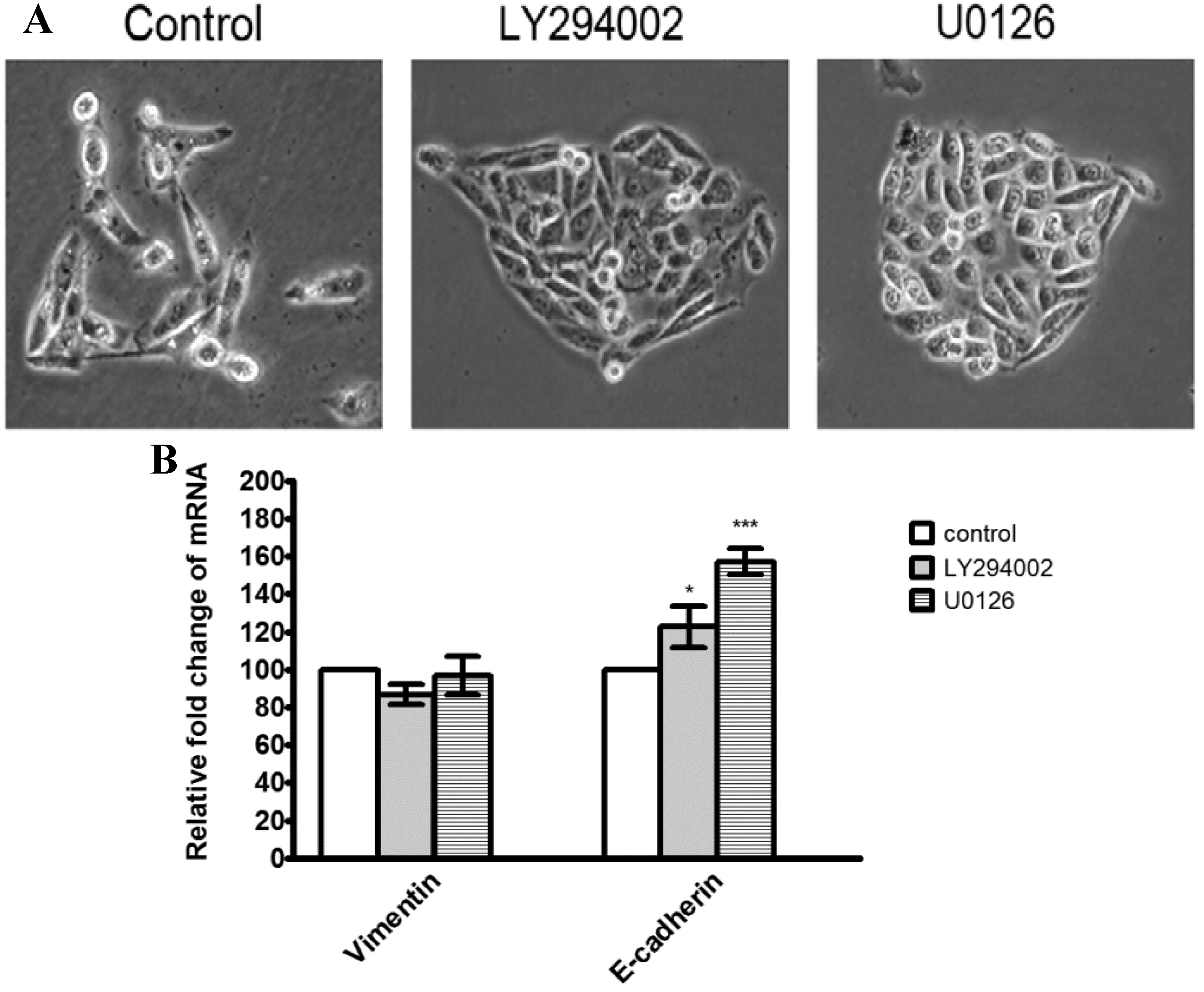 Effects of LY294002 and U0126 on epithelial-mesenchymal transition in PC-3 cell. (A) Cells were treated with LY294002 (20 μM) or U0126 (40 μM) for 24 h and cell morphology were photographed (100× magnification). (B) The mRNA expression of E-cadherin and vimentin were analyzed by quantitative real-time PCR and expressed as mean ± S.D. of three independent experiments. * p < 0.05, *** p < 0.001, compared with the untreated control.
