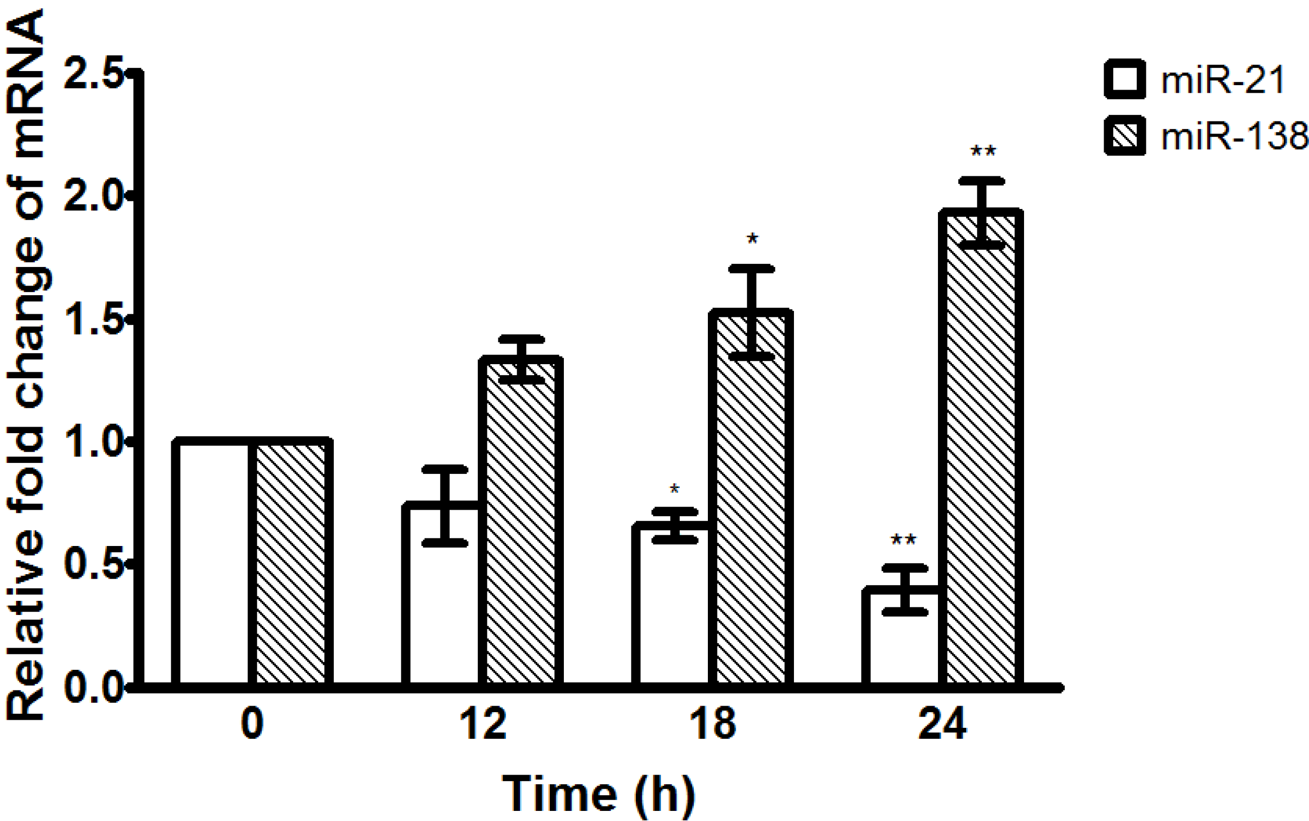 Effects of α-solanine on the expression of miR-21 and miR-138. Cells were treated with 12 μM of α-solanine for 12, 18 and 24 h and the expressions of miR-21 and miR-138 were analyzed by quantitative real-time PCR. Data are expressed as mean ± S.D. of three independent experiments.* p < 0.05, ** p < 0.01 compared with the untreated control.