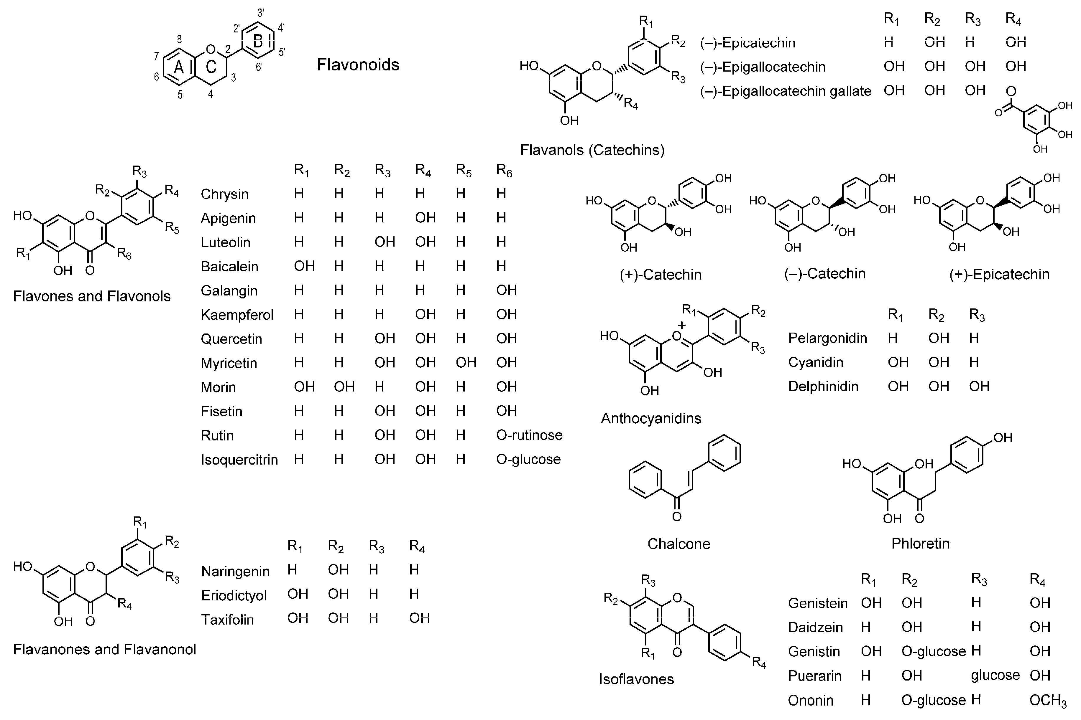 Flavonoids constitute one of the most ubiquitous groups of phytochemicals contained in medicinal plants, nutraceutical plant foods, dietary botanical supplements, and herbal remedies. They have the common skeleton of a chromane ring with aromatic rings attached at the 2- or 3-position that are labeled with A, B, and C (Figure 1). Based on the difference of substituents and the oxidation status of a heterocyclic C ring, flavonoids are divided into flavone, flavonol, flavanone, flavanonol, flavanol (catechin), anthocyanidin with an oxonium ion O+ in the C ring, chalcone lacking the C ring, and isoflavone with the C ring at the 3-position. Isoflavones should probably be classified as isoflavonoids, not flavonoids.
