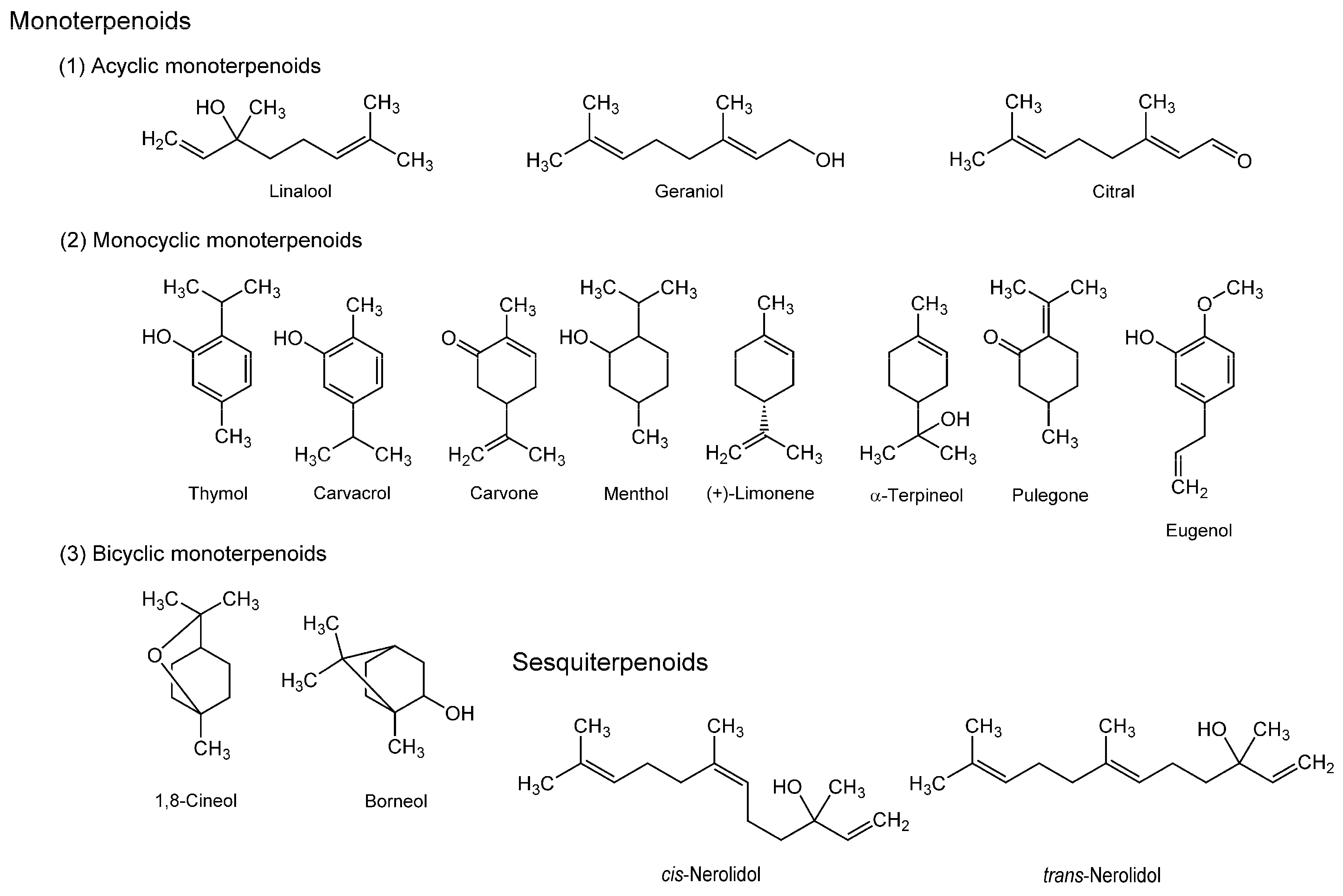 Monoterpenoids in essential oils consist of acyclic, monocyclic, and bicyclic ones (Figure 2). Acyclic monoterpenoids include (1) linalool from coriander (Coriandrum sativum) used in cooking and medicinally for diabetes and inflammatory diseases; (2) geraniol contained in rose and palmarosa oil with antimicrobial activity; and (3) citral present in the essential oils from lemon myrtle, lemongrass, lime, lemon, and orange, which are used as a flavoring agent with antimicrobial quality. Monocyclic monoterpenoids include (1) thymol contained at a significantly high concentration in thyme (Thymus vulgaris), a spicy culinary herb to be used for antiseptic mouthwash, cough, and bronchitis, and contained in oregano (Origanum vulgare), a common culinary herb to be used for stomach, respiratory, and infectious diseases; (2) carvacrol from oregano (Origanum vulgare and Origanum majorana); (3) carvone contained in caraway (Carum carvi) to be used for upset stomach, nausea, and gastrointestinal spasm, and contained in spearmint (Mentha spicata) to be used for digestive disorder, fever, and headache; (4) menthol contained in spearmint and peppermint (Mentha piperita) to be used for heartburn, nausea, abdominal pain, and gastrointestinal spasm; (5) (+)-limonene, a main odor component in citrus (the family Rutaceae) to be used as a flavoring agent with insecticide activity; (6) α-terpineol contained in the essential oils from laurel (Laurus nobilis), rosemary (Rosmarinus officinalis), and anise (Pimpinella anisum), which are used as an ingredient in perfumes, cosmetics, and flavors; and (7) pulegone contained in horse mint (Mentha longifolia), peppermint (Mentha piperita), and catnip (Nepeta cataria). Thymol and carvacrol may be also classified as terpenoid phenols or phenylpropanoids together with monoterpenoid eugenol, a bioactive component in aromatic plants. The best natural source of eugenol is clove (Eugenia aromatica or Syzygium aromaticum) that has been used for toothache, upset stomach, nausea, and diarrhea, and for mouth and throat inflammation. Eugenol is also present in oregano (Origanum vulgare) and cinnamon (Cinnamomum verum) to be used as a spice with potential health benefits. Bicyclic monoterpenoinds include (1) 1,8-cineol (or eucalyptol) contained in the oil from Eucalyptus globulus, which is used as an ingredient in mouthwash and cough suppressant and as an insecticide; and (2) borneol contained in cardamom (Elettaria cardamomum), nutmeg (Myristica fragrans), and ginger (Zingiber officinale), all of which are consumed as spices. Ginger is also used for nausea, cold, headache, rheumatism, cardiovascular diseases, sedation, and anticonvulsion in traditional medicine, and for enhancing the penetration of other drugs in modern clinical application.